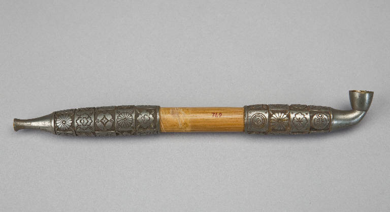 Pipa (enkan o kiseru) in bambù laccato e bronzo argentato. Le parti argentate sono decorate a sbalzo e incisione con motivi stilizzati di vario genere sistemati entro quadrati appaiati
