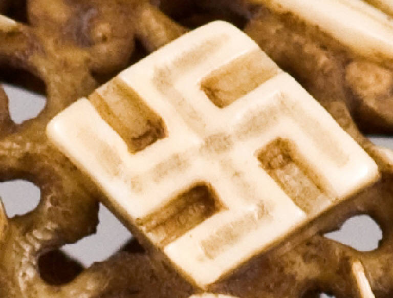 Netsuke di tipo ryusa-manju raffigurante su un lato alcuni simboli beneauguranti, tra i quali una svastica (manji), una losanga chiusa, un pipistrello, due gioielli sacri (tama), di cui uno fiammeggiante (hoju no tama), uno scettro ju-i e un corno di rinoceronte; l'altro lato è invece intagliato con una grande corolla stilizzata a sei petali