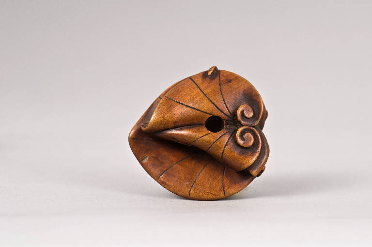Su una foglia di loto (hasu) sta posato uno stelo fogliato di fiori di crisantemo (kiku). E' presente un solo foro sul lato inferiore della composizione