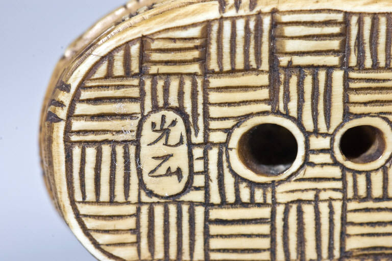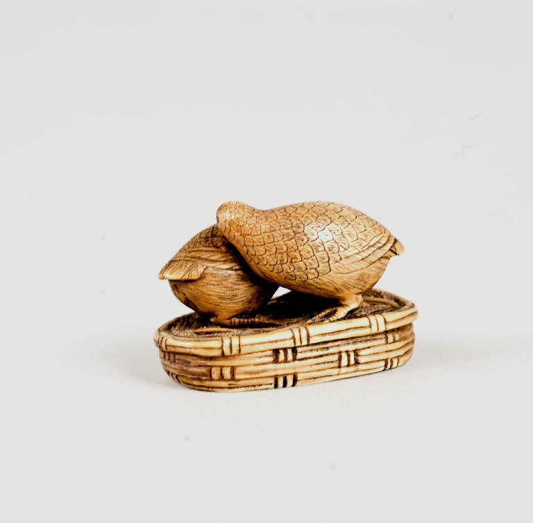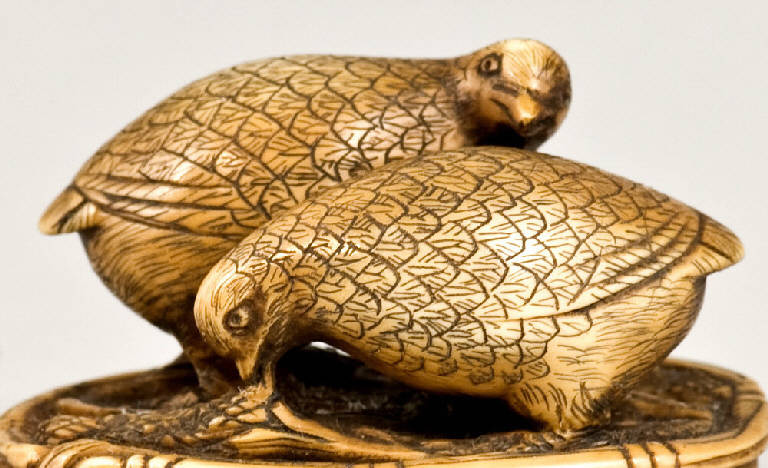 - NOTIZIE STORICO CRITICHE I netsuke di quaglie più noti furono realizzati da Okatomo, artista attivo a Kyoto (v. inv. n. 5680); un suo pezzo con questo soggetto, molto simile per impostazione a questo esemplare della collezione Lanfranchi, è illustrato in Barry Davies Oriental Art 1996, n. 40.||Nessuno dei due Mitsumasa elencati dal Davey (1974, p. 497, nn. 1616-1617) può essere associato con l'autore di questo pezzo