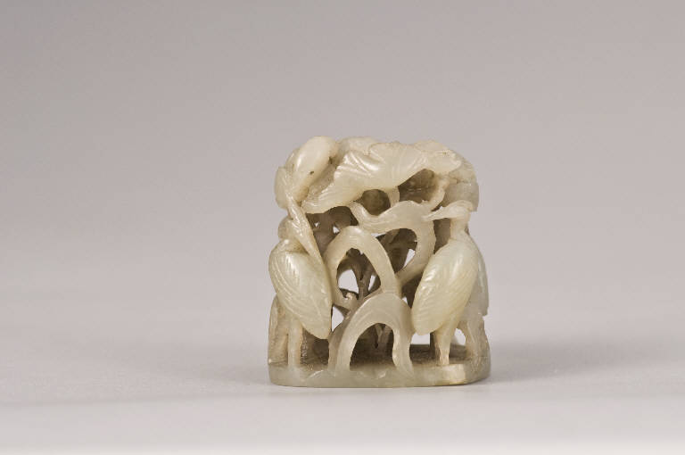 Questo okimono raffigura un gruppo di gru (tsuru) tra foglie di loto (hasu). La gru rappresenta un desiderio di longevità; un gruppo moltiplica questo anelito