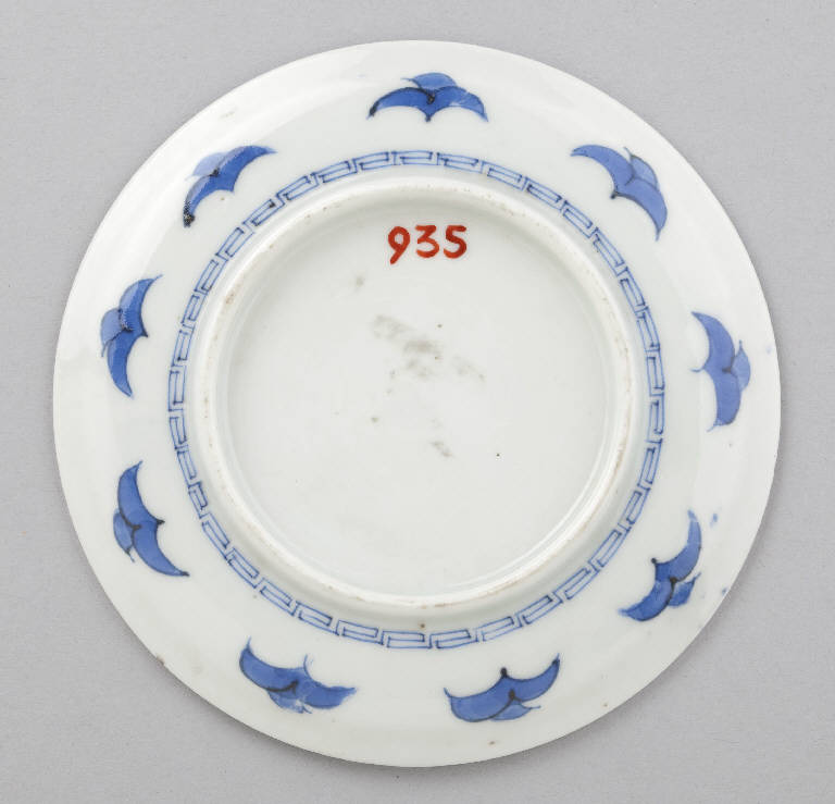 Piattino circolare in porcellana dipinto in blu al di sotto dell'invetriatura trasparente. Sulla superficie a vista si stagliano alcune riserve dalla cornice vagamente circolare, con andamento mosso: in alcune più piccole si vedono motivi vegetali, mentre in una più grande è visibile uno scorcio di paesaggio con figura umana
