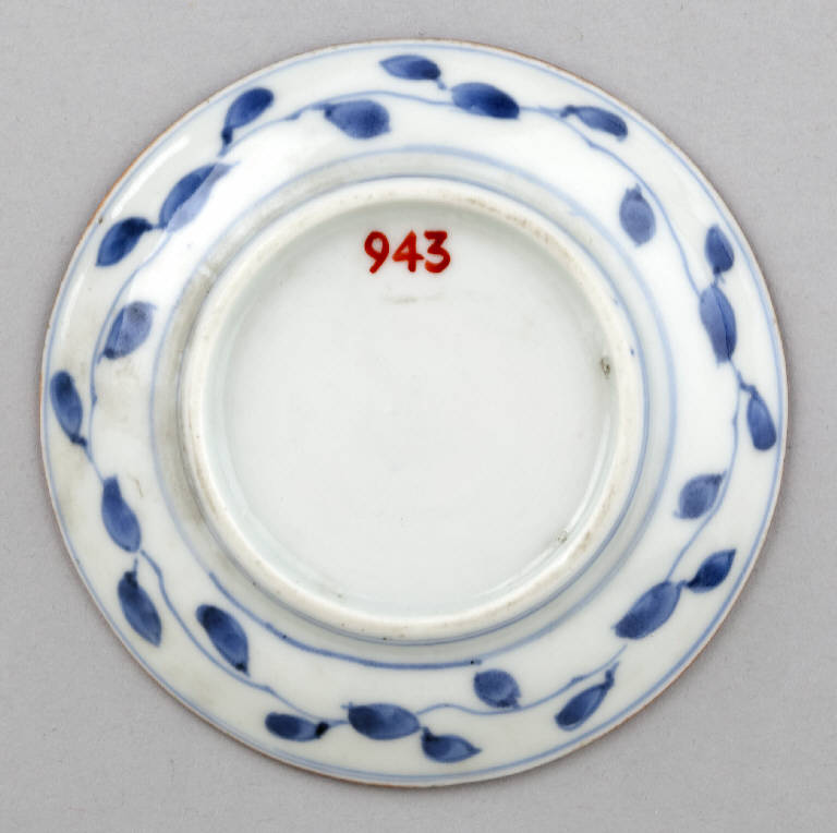Piattino circolare in porcellana dipinto in blu al di sotto dell'invetriatura trasparente. Sulla superficie a vista, tra fondo e tesa, si stagliano radialmente sei riserve a goccia, all'interno di ognuna delle quali è raffigurata una piccola scena, tra scorci di paesaggio, figure, animali, fiori e uccelli