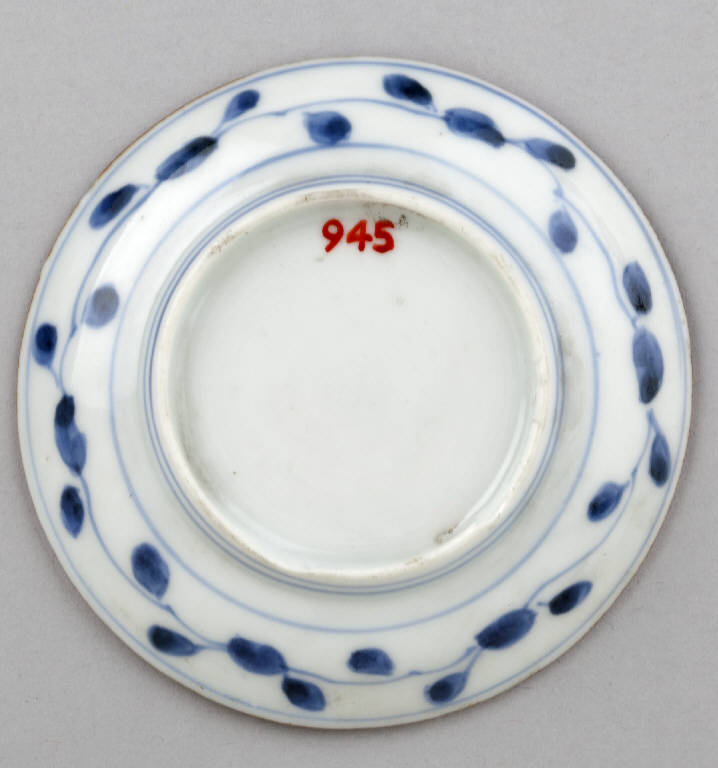 Piattino circolare in porcellana dipinto in blu al di sotto dell'invetriatura trasparente. Sulla superficie a vista, tra fondo e tesa, si stagliano radialmente sei riserve a goccia, all'interno di ognuna delle quali è raffigurata una piccola scena, tra scorci di paesaggio, figure, animali, fiori e uccelli