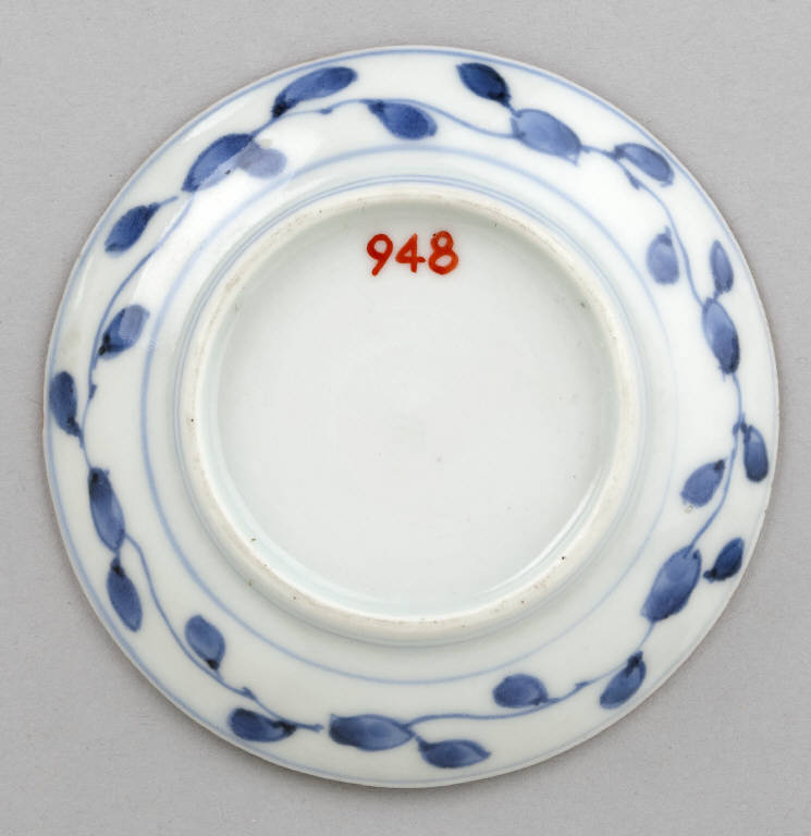 Piattino circolare in porcellana dipinto in blu al di sotto dell'invetriatura trasparente. Sulla superficie a vista, tra fondo e tesa, si stagliano radialmente sei riserve a goccia, all'interno di ognuna delle quali è raffigurata una piccola scena, tra scorci di paesaggio, figure, animali, fiori e uccelli