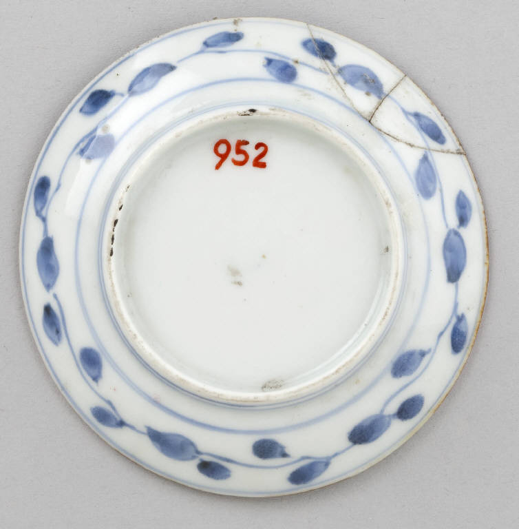 Piattino circolare in porcellana dipinto in blu al di sotto dell'invetriatura trasparente. Sulla superficie a vista, tra fondo e tesa, si stagliano radialmente sei riserve a goccia, all'interno di ognuna delle quali è raffigurata una piccola scena, tra scorci di paesaggio, figure, animali, fiori e uccelli