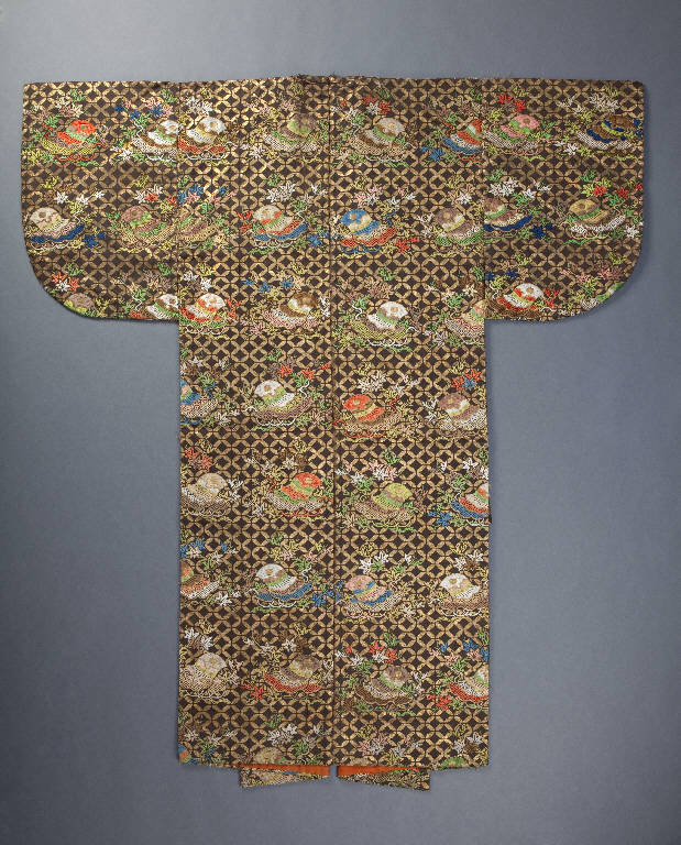 Abito da teatro di tipo karaori (letteralmente "tessitura cinese"). Armatura di fondo diagonale in seta opaca con fili laminati in oro e trame supplementari in seta lasciata "lenta" in modo da creare disegni che sembrino ricami. Colore prevalente marrone con disegni policromi su fondo oro a graticola (losanghe lombate e incrociate), di anatra mandarina (oshi dori) tra foglie di acero (momiji), alternativamente rivolta verso destra e verso sinistra. Il motivo è disposto su file orizzontali, parallele e perpendicolari; il corpo dell'anatra è decorato con minute losanghe (ireko bishi). Fodera color marrone/ mattone e maniche piccole (kosode)