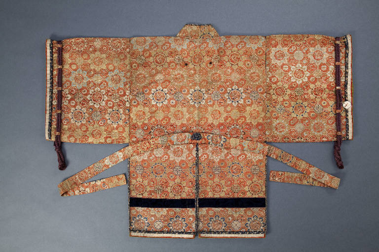 Variante shokko nikishi (spesso tradotta con lampasso). Tessuto in seta operato con disegni per trame supplementari in seta molto lucida e spessa con filati in oro. Fondo rosso aranciato, disegno in policromia e oro di maglie ottagonali ad incastro perfetto con fiori convenzionali, frontali e stilizzati, con otto petali carenti e lombati. Entro gli ottagonali "fiori cinesi" (karahana) stilizzati contenuti in cornici lobate. Delle linee (quattro) congiungono il karahana. Guarnizioni di velluto operato a tinta blu. Due nodi a pendagli in cordoncino di seta ad altezza maniche. Cintura fissata nella parte posteriore. Orli alle maniche e lembi inferiori percorsi da tripla decorazione di fettucce bianche, rosse e verdi. Fodera interna viola