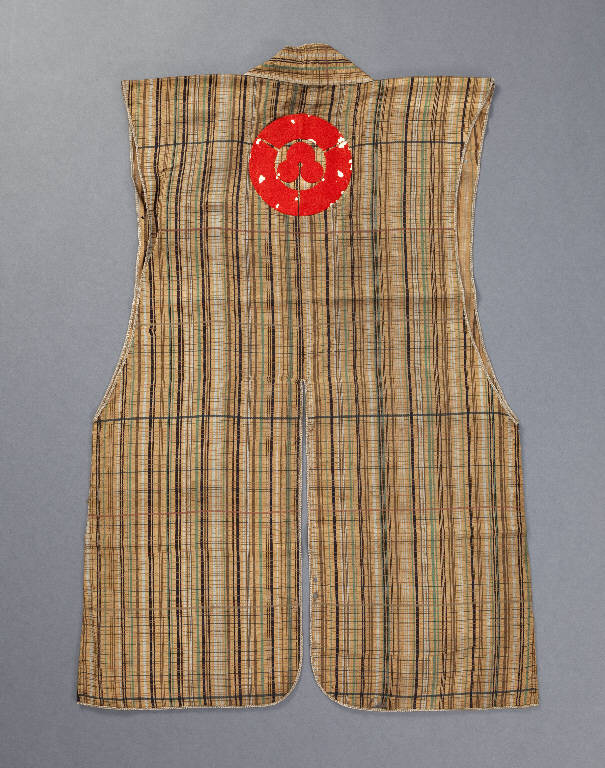 Sopravveste maschile senza maniche (jinbaori) in tessuto operato con trame supplementari in oro e seta policroma. Sul fondo di seta gialla si sviluppa un motivo di righe di vario colore (verde, celeste e marrone) e diverse dimensioni che si intersecano con andamento parallelo e perpendicolare (koshi). Sui risvolti tessuto di seta operata con disegni policromi di fiori fantasiosi e fogliame disposti in modo sparso (chirashi moyo). Sul retro giustapposizione di stemma gentilizio (kamon) in lana rossa con stilizzazione di tre foglie di malva (aoi) entro cornice circolare. Spalline rosse