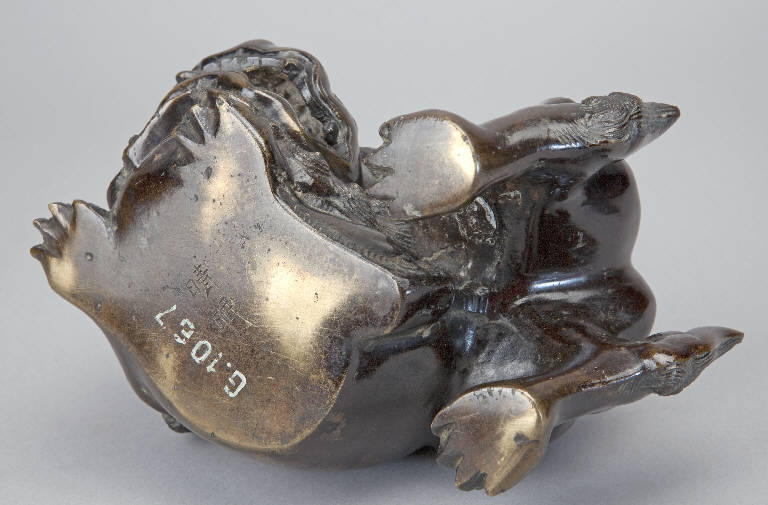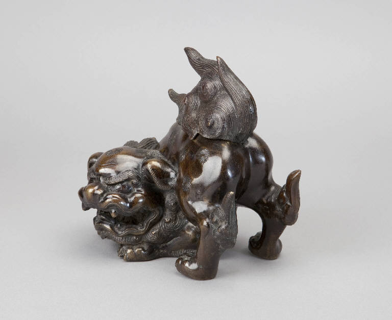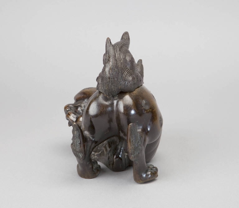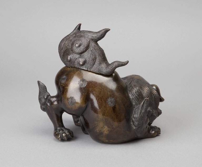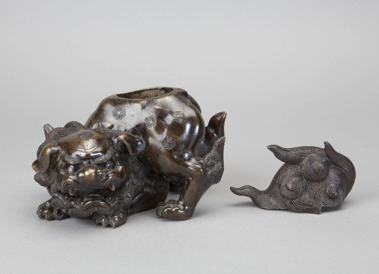 Bruciaprofumi (koro) in bronzo lavorato a fusione (chukin) in forma di "leone cinese" (karashishi). La coda ricciuta funge da coperchio