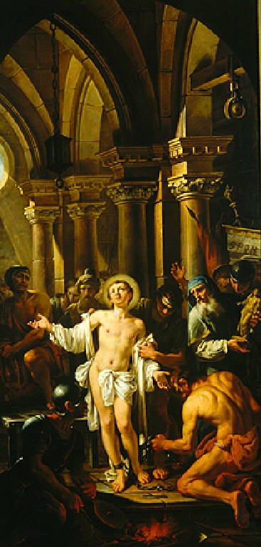 La scena si svolge in un interno, di cui si vedono sulla destra una fuga di colonne che sostengono ogive; al centro in primo piano è il santo adolescente che apre le braccia, mentre alcuni sgherri gli tolgono le vesti e le catene. In primissimo piano un soldato di profilo aziona un mantice per attizzare il fuoco del martirio. Ai lati e alle spalle del protagonista, un folto gruppo di figure assiste alla scena
