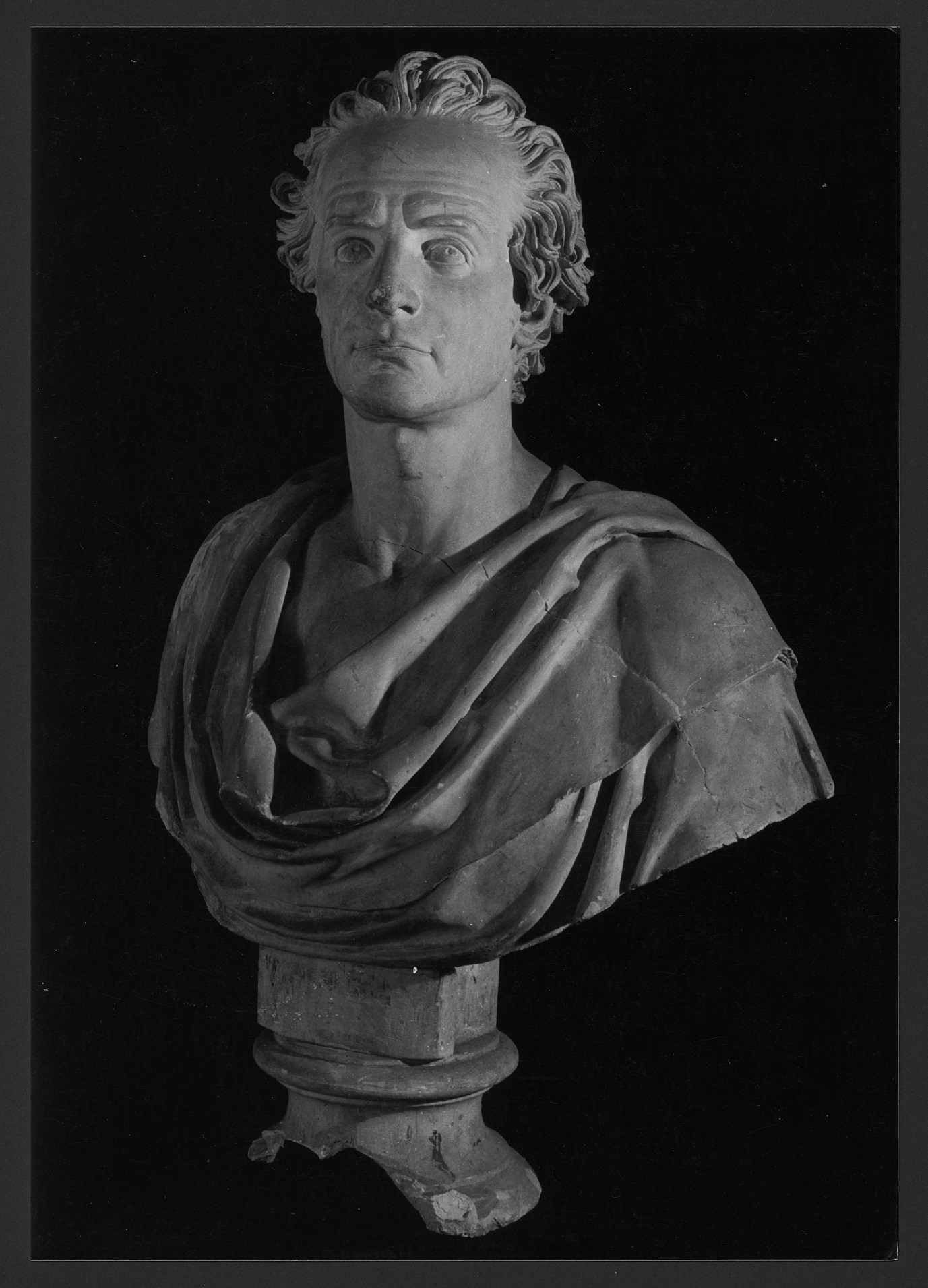 - NOTIZIE STORICO CRITICHE Il calco è tratto da un busto raffigurante Vittorio Alfieri (1749-1803) attribuito a Pompeo Marchesi (1783-1858), conservato nel Museo del Risorgimento - Palazzo Ottolenghi di Asti. Allo stato attuale degli studi non è possibile determinare la data d’ingresso del gesso nel patrimonio dell’Accademia né dove e quando sia stato formato, per questo vengono indicati come estremi cronologici il 1800 circa e il 1963. La prima data è puramente indicativa e fa riferimento all'inizio dell'attività lavorativa di Marchesi. La seconda data fa, invece, riferimento all’ultima acquisizione di calchi da parte dell’Accademia Carrara. Il gesso è stato preso in considerazione nella tesi di laurea di Lucrezia Bertoli