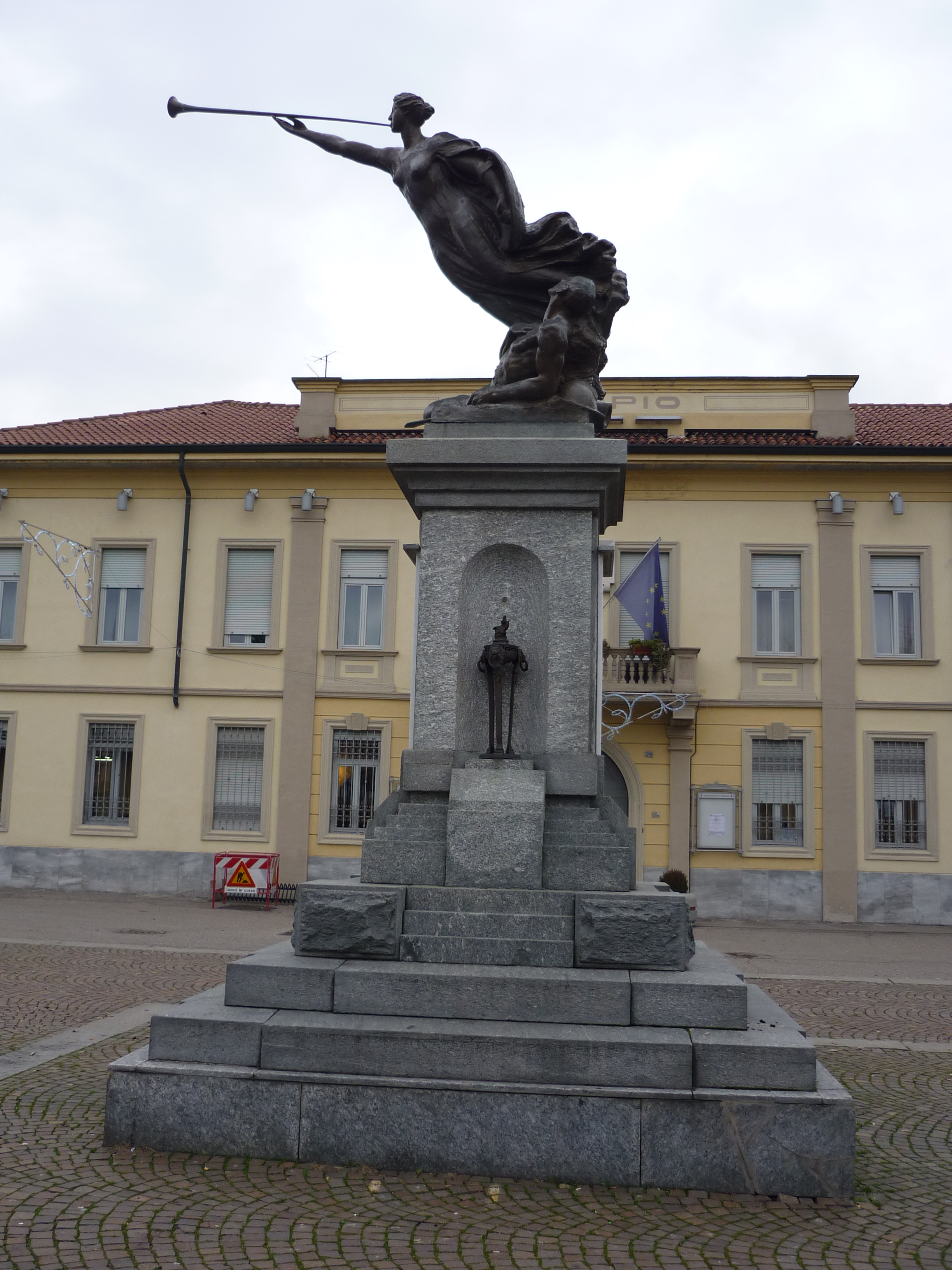 Scultura in bronzo che rappresenta la Vittoria che dà fiato alla tromba ed un soldato caduto. Il gruppo scultoreo poggia su un alto basamento con una nicchia su un lato dove è inserita una fiaccola in bronzo. Sugli altri lati sono affisse le targhe in marmo con incisi i nomi dei caduti delle due guerre mondiali con relativa dedica