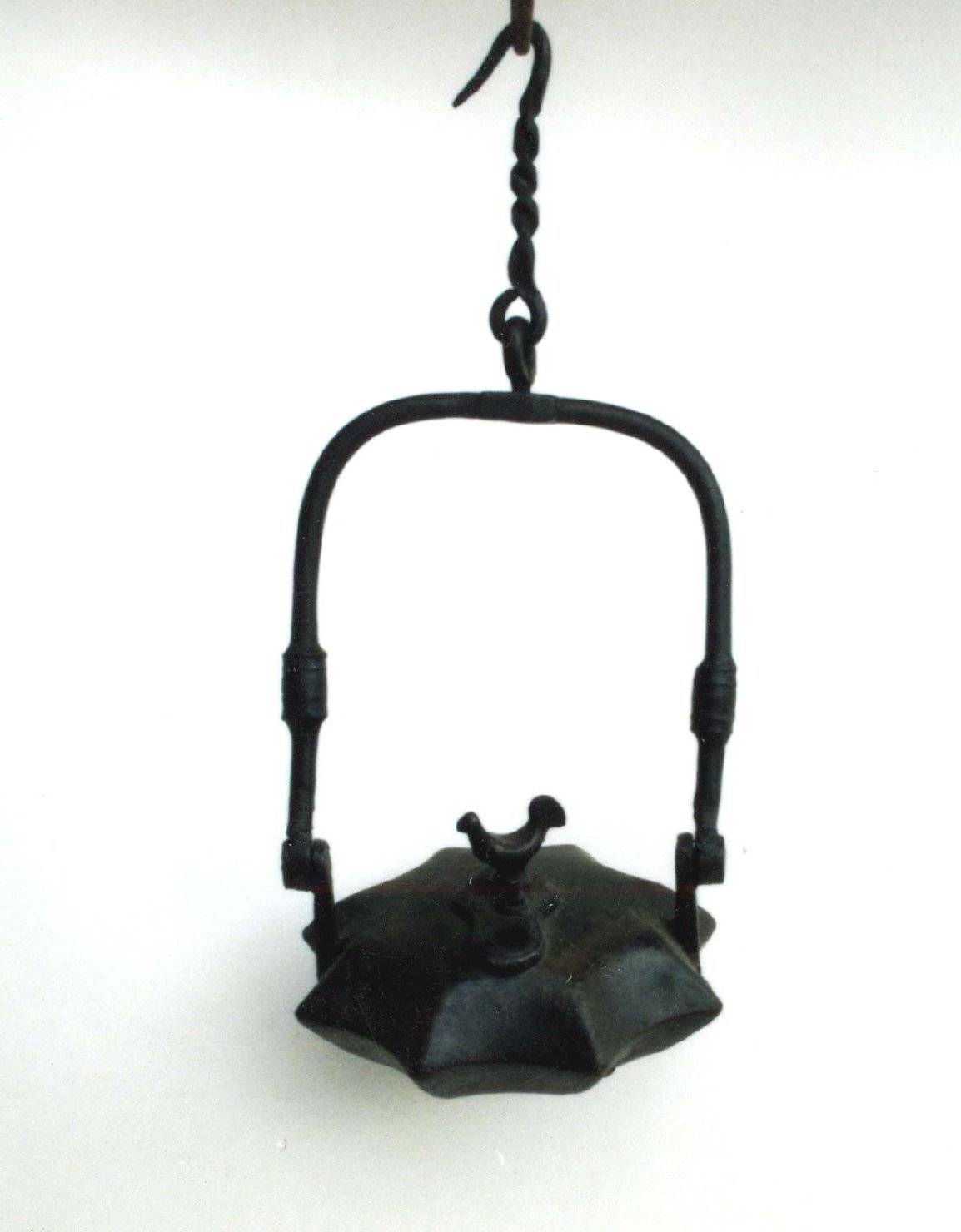 Ferro forgiato. Il porta olio di forma ottagonale a bombatura è sormontato da un galletto in ferro con rocchetti. Il gancio di sospensione è attorcigliato al centro. Sui due lati attacchi tengono allacciato l'arco in ferro
