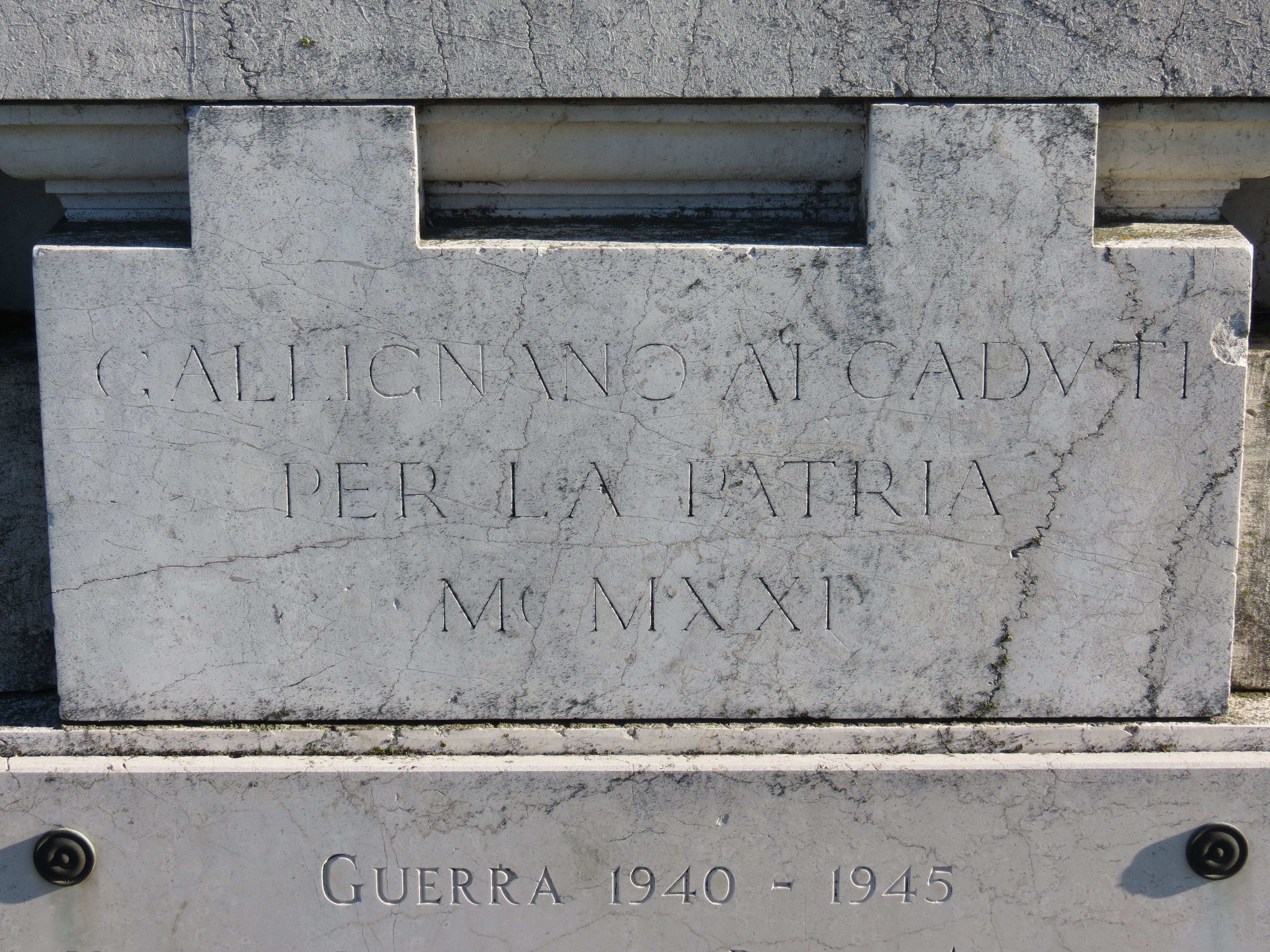 - ISCRIZIONI stele, lato frontale, lapide superiore - 1915/ CARUBELLI FRANCESCO/ CICOGNANI GIUSEPPE/ FACCHINETTI FELICE/ GIOVANNI GIUSEPPE/ PEDETTI CARLO/ STAGNI VINCENZO/ TERZI ALESSANDRO/ ZIGLIOLI GEROLAMO/ 1916/ BIONDI VIRGILIO/ MANENTI GIUSEPPE/ PEDETTI GIOVANNI/ 1917/ BAZZINI GIUSEPPE/ BERGAMASCHI CARLO/ BIONDI FRANCESCO/ BOLZANI GIOVANNI/ BOSIO GIOVANNI/ BE[…]I GIUSEPPE/ MEAZZA ATTILIO/ 1917/ BRAMBILLA MARCO/ GUARNERI BATTISTA/ MARCARINI GIACOMO/ MARTINELLI PIETRO/ POLLINI LORENZO/ SERELLINI ANTONIO/ ZAMOLO GIUSEPPE/ 1918/ CAGNI GIACOMO/ DELFANTI AMBROGIO/ MAGGI DOMENICO/ MORO ALESSANDRO/ 1919/ FONTANA GIO-BATTISTA/ GRANDELLI LUIGI/ OLDANI ANDREA/ SOLDO ANGELO/ VALCARENGHI EMILIO/ PISONI CARLO -