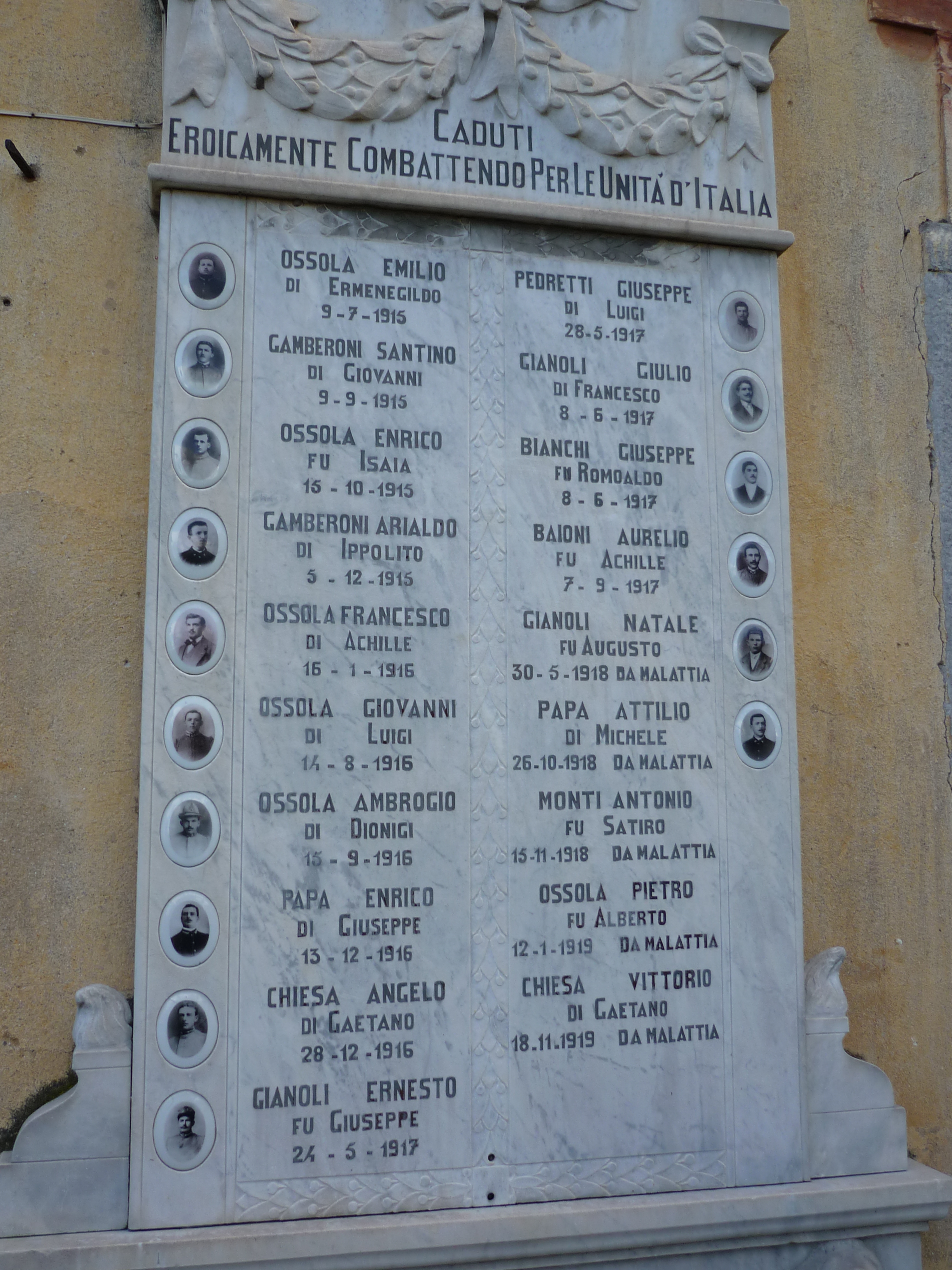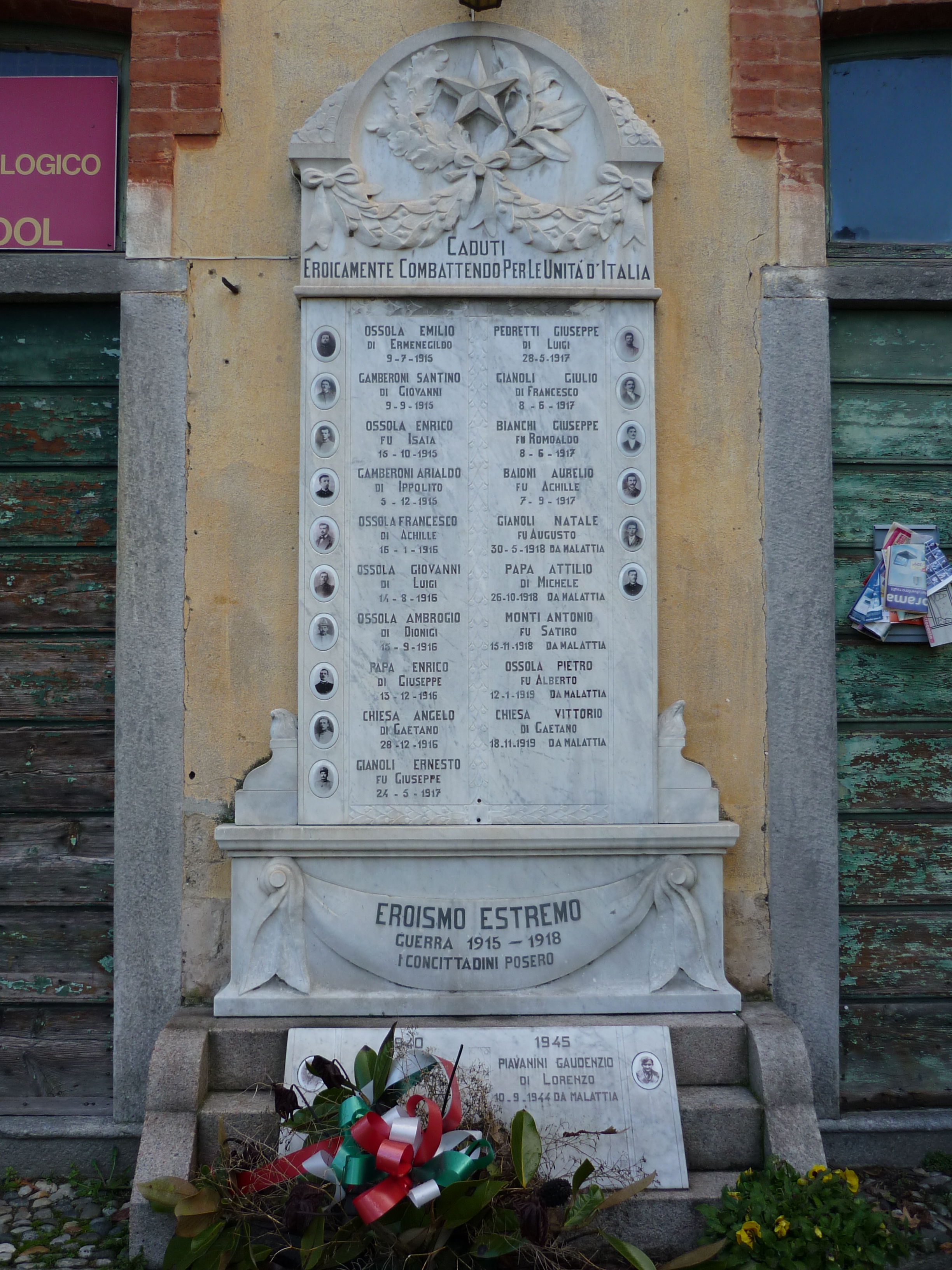 - ISCRIZIONI fronte, su lastra in marmo - CADUTI/ EROICAMENTE COMBATTENDO PER LE UNITA’ D’ITALIA OSSOLA EMILIO/ DI ERMENEGILDO/ 9-7-1915/ GAMBERONI SANTINO/ DI GIOVANNI/ 9-9-1915/ OSSOLA ENRICO/ FU ISAIA/ 15-10-1915/ GAMBERONI ARIALDO/ DI IPPOLITO/ 5-12-1915/ OSSOLA FRANCESCO/ DI ACHILLE/ 16-1-1916/ OSSOLA GIOVANNI/ DI LUIGI/ 14-8-1916/ OSSOLA AMBROGIO/ DI DIONIGI/ 15-9-1916/ PAPA ENRICO/ DI GIUSEPPE/ 13-12-1916/ CHIESA ANGELO/ DI GAETANO/ 28-12-1916/ GIANOLI ERNESTO/ FU GIUSEPPE/ 24-5-1917 PEDRETTI GIUSEPPE/ DI LUIGI/ 28-5-1917/ GIANOLI GIULIO/ DI FRANCESCO/ 8-6-1917/ BIANCHI GIUSEPPE/ FU ROMOALDO/ 8-6-1917/ BAIONI AURELIO/ FU ACHILLE/ 7-9-1917/ GIANOLI NATALE/ FU AUGUSTO/ 30-5-1918 DA MALATTIA/ PAPA ATTILIO/ DI MICHELE/ 26-10-1918 DA MALATTIA/ MONTI ANTONIO/ FU SATIRO/ 15-11-1918 DA MALATTIA/ OSSOLA PIETRO/ FU ALBERTO/ 12-1-1919 DA MALATTIA/ CHIESA VITTORIO/ DI GAETANO/ 18.11.1919 DA MALATTIA EROISMO ESTREMO GUERRA 1915 – 1918 I CONCITTADINI POSERO - caratteri vari -