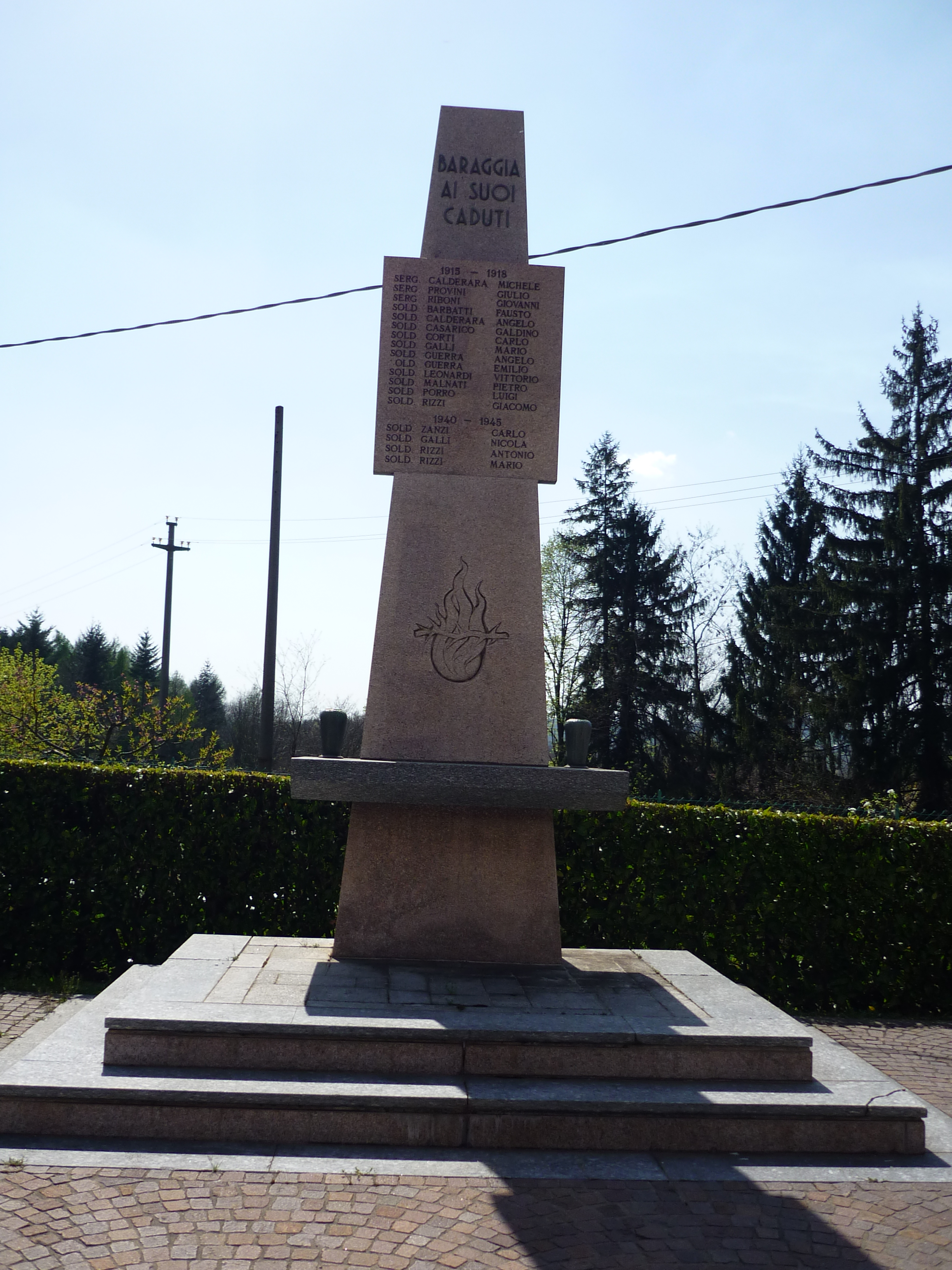 - ISCRIZIONI lato anteriore - BARAGGIA/ AI SUOI/ CADUTI 1915 - 1918/ SERG. CALDERARA MICHELE/ SERG. PROVINI GIULIO/ SERG. RIBONI GIOVANNI/ SOLD. BARBATTI FAUSTO/ SOLD. CALDERARA ANGELO/ SOLD. CASARICO GALDINO/ SOLD. CORTI CARLO/ SOLD. GALLI MARIO/ SOLD. GUERRA ANGELO/ SOLD. GUERRA EMILIO/ SOLD. LEONARDI VITTORIO/ SOLD. MALNATI PIETRO/ SOLD. PORRO LUIGI/ SOLD. RIZZI GIACOMO 1940 – 1945 SOLD. ZANZI CARLO/ SOLD. GALLI NICOLA/ SOLD. RIZZI ANTONIO/ SOLD. RIZZI MARIO - caratteri vari - a caratteri applicati -