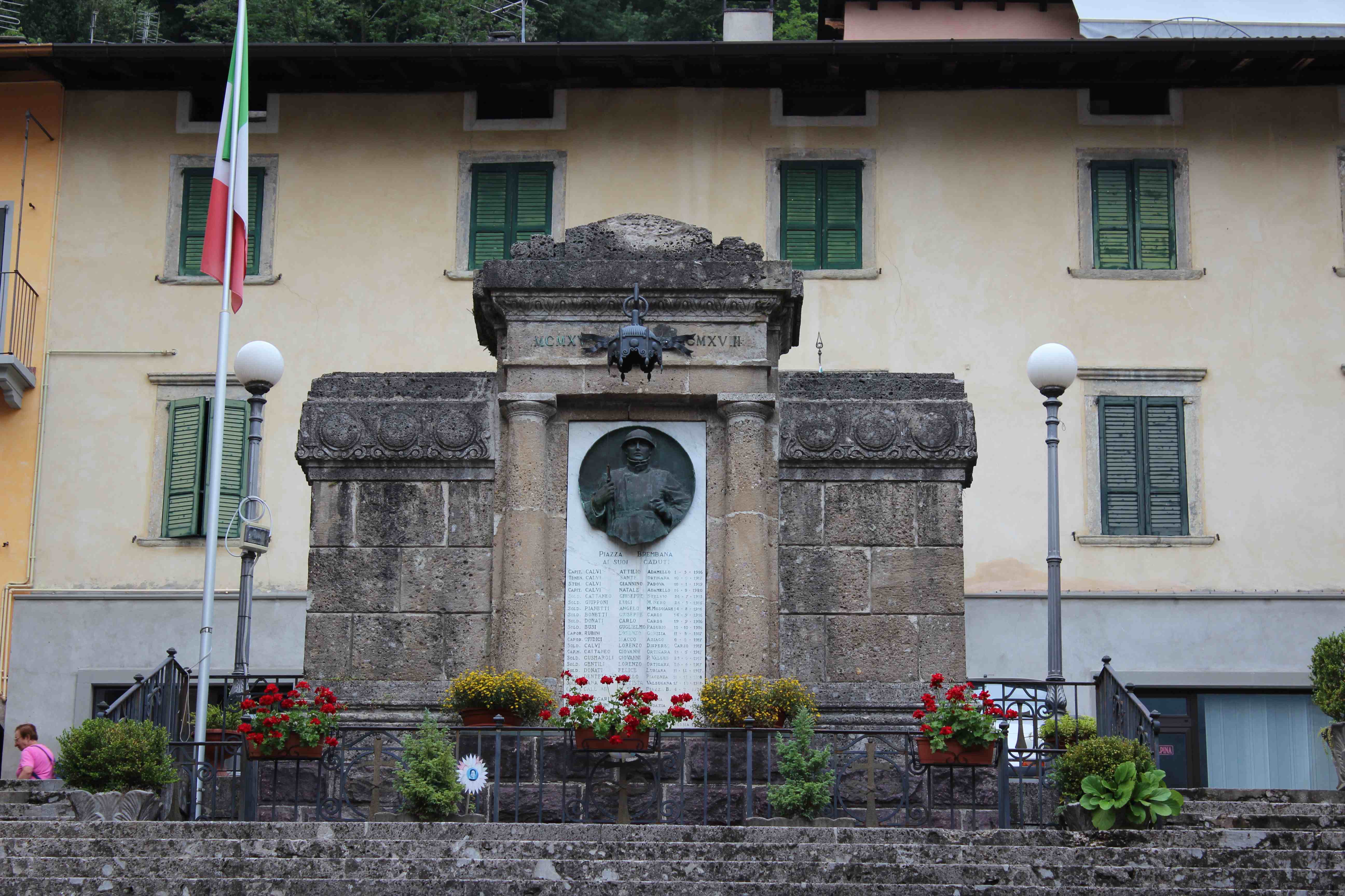 - ISCRIZIONI sulla lapide - PIAZZA BREMBANA / AI SUOI CADUTI / CAPIT. CALVI ATTILIO ADAMELLO 1.5.1916 / TENEN. CALVI SANTE ORTIGARA 10.6.1917 / S. TEN. CALVI GIANNINO PADOVA 10.1. 1919 / CAPIT. CALVI NATALE ADAMELLO 16.9.1920 / SOLD. CATTANEO GIUSEPEP STELVIO 26.7.1915 / SOLD. GIUPPONI LUIGI M. NERO 26.5.1916 / SOLD. PIANETTI ANGELO M. MOSOIAGH 14.8.1916 / SOLD. BONETTI GIUSEPPE CARSO 14.9.1916 / SOLD. DONATI CARLO CARSO 14.9.1916 / SOLD. BUSI GUGLIELMO PASUBIO 10.10.1916 / CAPOR. RUBINI LORENZO GORIZIA 11.5.1917 / CAPOR. GIUDICI ISACCO ASIAGO 6.6.1917 / CAPOR. CALVI LORENZO DISPERSO CARSO 1917 / CAP. M. CATTANEO GIOVANNI ORTIGARA 21.5.1917 / SOLD. GUSMAROLI GIOVANNI P. VALLES 23.6.1917 / SOLD. GENTILI LORENZO ORTIGARA 26.6.1917 / SOLD. DONATI FELICE LUBIANA 11.12.1917 / SOLD. DENTELLA ANGELO PIACENZA 11.10.1918 / SOLD. BANA BATTISTA VALSUGANA 17.10.1918 / CAPOR. CALLEGARI GIUSEPPE PIAZZA B. 4.2.1920 / S. TEN CELGARI GIUSEPPE RUSSIA 15.3.1943 / SOLD. PARONCINI DOMENICO CROAZIA 30.1.1942 / SOLD. CALEGARI SANTINO BERGAMO 16.1.1944 / SOLD. DONATI CARLO PIAZZA B. 21.6.1947 / SERG. BORTOLOTTI MARIO DISPERSO RUSSIA 1943 / CAP. M. BETTI LORENZO DISPERSO RUSSIA 1943 / SOLD. GUSMAROLI VITTORIO DISPERSO RUSSIA 1943 / SOLD. SALVI PIETRO DISPERSO RUSIA 1943 - capitale - a incisione -
