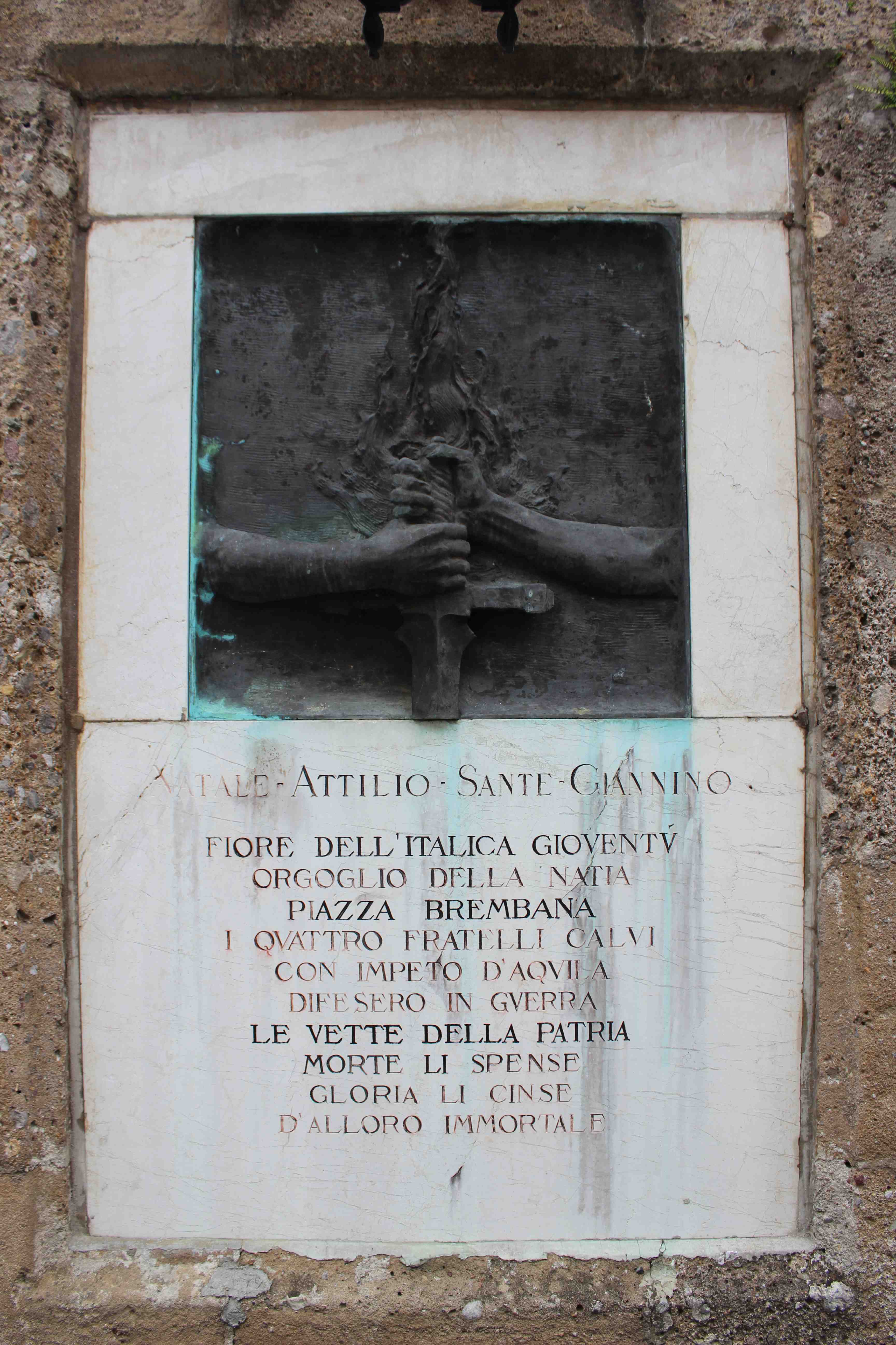 - NOTIZIE STORICO CRITICHE Il monumento fu inaugurato nel 1922 e restaurato nel 1986 (20 ottobre). Costruito davanti alla casa dei fratelli Calvi per volontà della madre dei caduti che donò l'area per l'edificazione. Sulla targa posta a lato è indicato l'autore come Pietro Siccardi ma sul rilievo bronzeo sono le lettere G. S. che identificano lo scultore Giuseppe Siccardi, come riportato anche in bibliografia. Un riferimento si trova anche nell'Archivio della Soprintendenza ai Monumenti (SBAP MI, Archivio Monumenti A.V. 153, fascicolo 5, Bergamo)