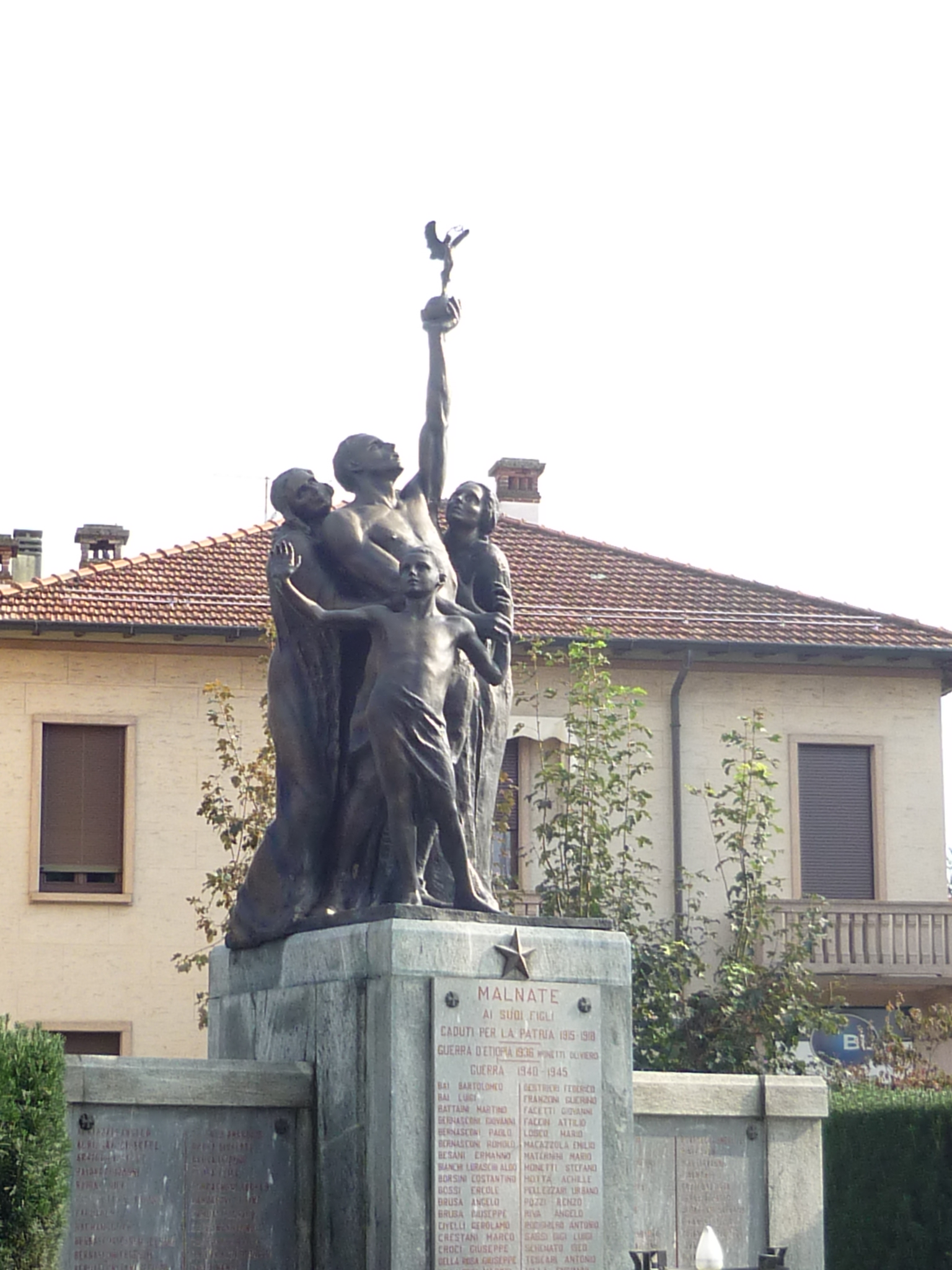 Monumento che ricorda il sacrificio dei cittadini malnatesi nelle guerre coloniali, nella prima e nella seconda guerra mondiale, il cui nome è inciso sulle lapidi. L’area del monumento ai caduti è delimitata da una serie di sfere in pietra collegate tra loro da catene in ferro. Monumento in pietra con lastre in marmo recanti i nomi dei caduti. Nella parte superiore, gruppo scultoreo in bronzo raffigurante un soldato con allegoria della Vittoria, due figure femminili e un giovane ragazzo: presumibilmente è l’allegoria del soldato che protegge due madri e il figlio