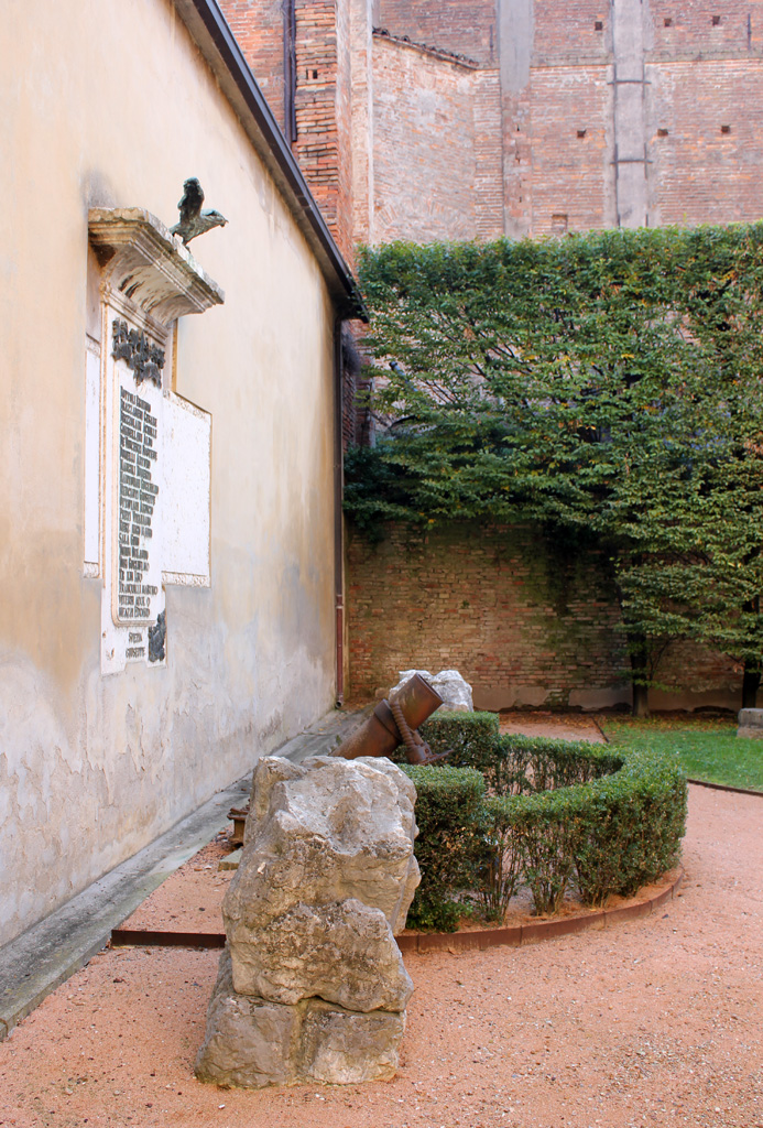 - NOTIZIE STORICO CRITICHE La lapide ai volontari mantovani caduti nella Grande Guerra fu inaugurata il 28 ottobre del 1926, come indicato nell'iscrizione dedicatoria; è probabile che la committenza (indicata nella lapide incisa "enti pubblici cittadini") sia da identificarsi con la Provincia di Mantova, della quale è presente lo stemma bronzeo. L'opera venne collocata nel giardino che fiancheggia il lato destro del famedio di San Sebastiano (famedio dal 1925), tra altri memoriali ai caduti di guerra, di seguito elencati: il cippo ai caduti dell'80° Reggimento Fanteria "Roma" (NCT 0303267167), il monumento ai militari mantovani caduti in mare (NCT 0303267166) ed il cippo in memoria di Angelo Parilla, morto nel 1918 (committenza del nipote, Achille Parilla, come da iscrizione). Il giardino, chiuso a sud dal convento di San Sebastiano, è stato oggetto di un recente intervento di ripristino (vedi ultima fotografia in allegato). Bibliografia di confronto: Monumenti ai mantovani caduti per la patria, Associazione nazionale combattenti e reduci. Federazione provinciale di Mantova, 2002 (il monumento non è elencato nel volume)