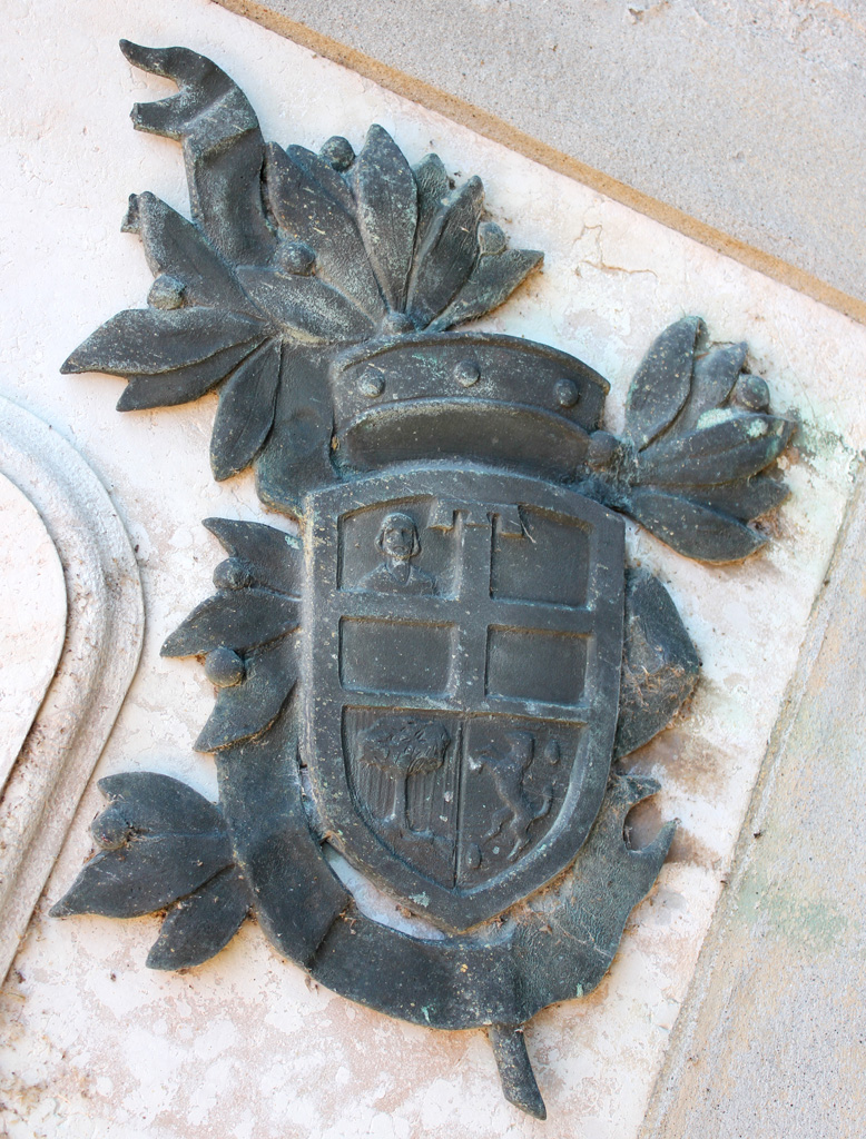 - STEMMI sulla lapide sinistra, angolo inferiore destro - civile - Stemma - Provincia di Mantova - scudo coronato, troncato e semipartito; nella parte superiore è lo stemma di Mantova, crociato con il busto di Virgilio; nella parte inferiore con quercia al naturale e con il cane rampante tra due staffe d'argento