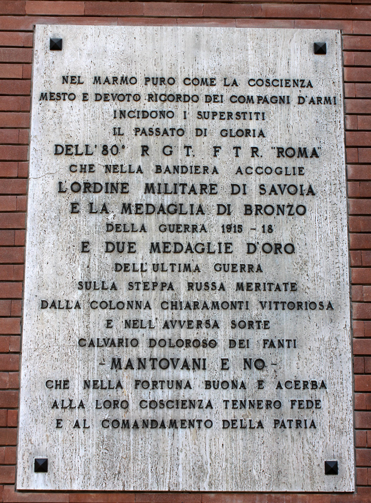 - ISCRIZIONI sulla lapide di travertino - NEL MARMO PURO COME LA COSCIENZA/ MESTO E DEVOTO RICORDO DEI COMPAGNI D'ARMI/ INCIDONO I SUPERSTITI/ IL PASSATO DI GLORIA/ DELL'80° R G T F T R "ROMA"/ CHE NELLA BANDIERA ACCOGLIE/ L'ORDINE MILITARE DI SAVOIA/ E LA MEDAGLIA DI BRONZO/ DELLA GUERRA 1915 - 18/ E DUE MEDAGLIE D'ORO DELL'ULTIMA GUERRA/ SULLA STEPPA RUSSA MERITATE/ DALLA COLONNA CHIARAMONTI VITTORIOSA/ E NELL'AVVERSA SORTE/ CALVARIO DOLOROSO DEI FANTI/ - MANTOVANI E NO -/ CHE NELLA FORTUA BUONA E ACERBA/ ALLA LORO COSCIENZA TENNERO FEDE/ E AL COMANDAMENTO DELLA PATRIA - capitale - a fusione -