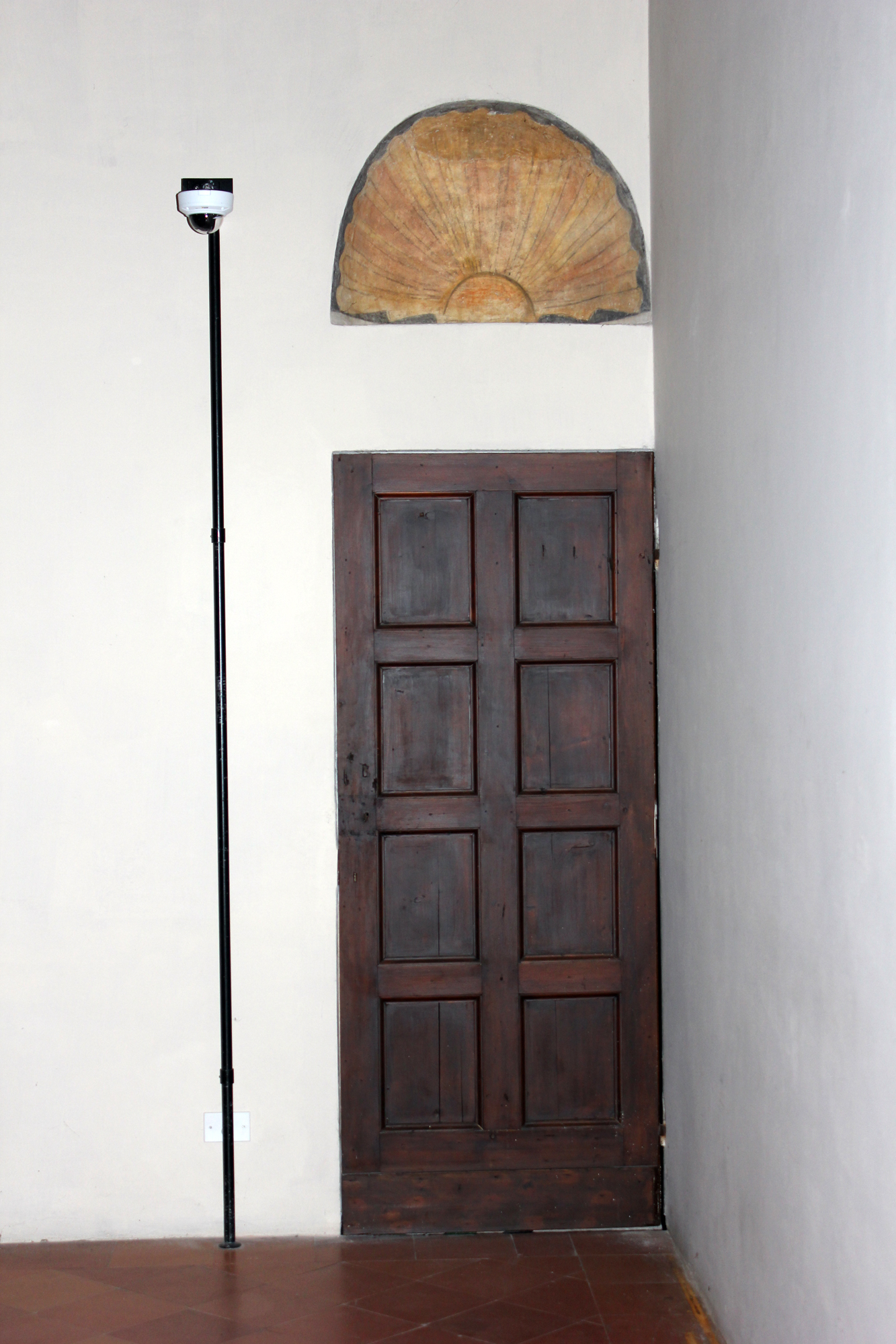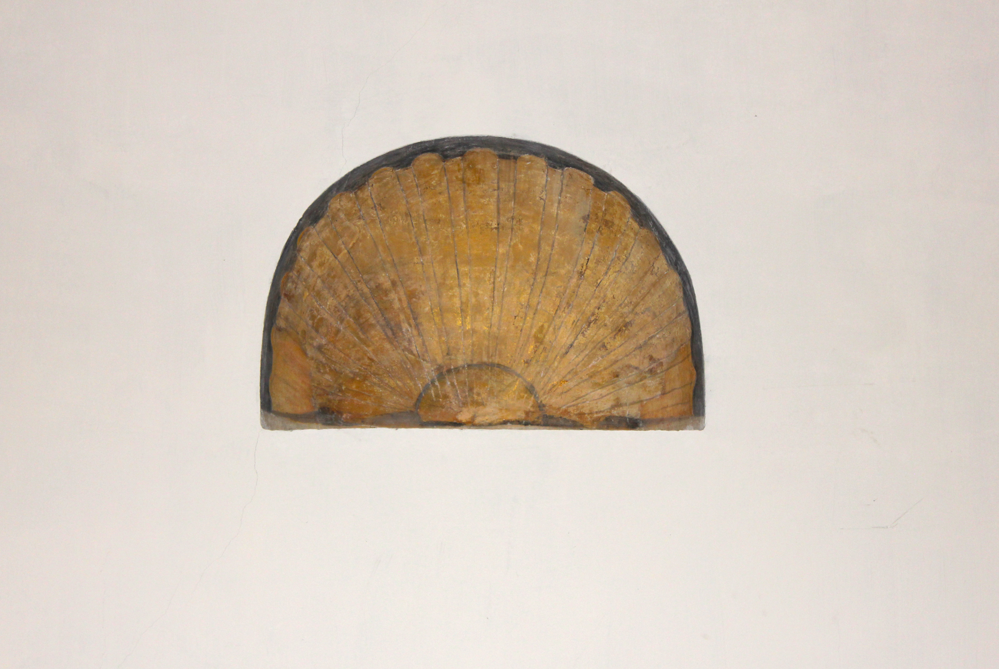 - NOTIZIE STORICO CRITICHE La coppia di sovraporta a conchiglia che si conserva nella parete nord della Sala delle Armi dovrebbe ricondursi ad un periodo anteriore rispetto al soffitto del 1549, risalente alle nozze di Francesco III Gonzaga con Caterina d'Austria. La Sala delle Armi già in epoca isabelliana rappresentava l'ambiente più ampio di snodo attorno a cui la marchesa aveva allestito il proprio appartamento coniugale incentrato sulla torre di sud-est: da qui si dipanava l'organizzazione dei diversi locali privati, i piccoli camerini. E' probabile che la coppia di sovraporta a conchiglia (che originariamente segnavano sia la comunicazione diretta con l'adiacente Sala delle Cappe, sia la rampa discendente alla Grotta delle Pause) sia stata dipinta durante il soggiorno in Castello dell'estense, anche in ragione della prossimità formale con altre nicchie dipinte nell'appartamento vedovile di Santa Croce (Cottafavi 1930). Peraltro, tali ornamenti non sembrano nemmeno riconducibili all'intervento approntato nel 1531, quando Giulio Romano e bottega ridecorarono la sala su commissione di Federico II. L'ambiente venne restaurato alla metà degli anni Venti, con un intervento sulle decorazioni pittoriche sostenuto dalla Banca Commerciale Italiana (Cottafavi 1926)