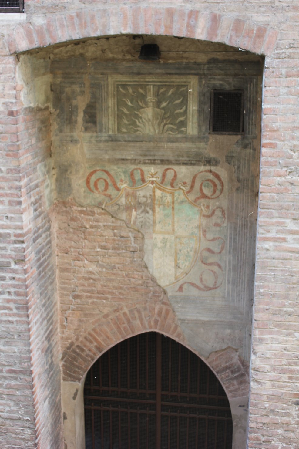 - NOTIZIE STORICO CRITICHE Ad incoronare quello che un tempo era l'accesso meridionale al Castello di San Giorgio campeggia ancora oggi l'impresa del Crogiolo: sopra la volta della controtorre di San Nicolò si conserva la divisa del marchese Francesco II, adottata dopo la battaglia di Fornovo (1495); la cronologia della decorazione è da collocarsi tra tale data e la scomparsa dello stesso Gonzaga. Si ricorda che nel corso del terzo decennio del Novecento furono ricostruiti gli originari accessi a sud e ad est del pianterreno del Castello (Cottafavi 1931, p. 526)