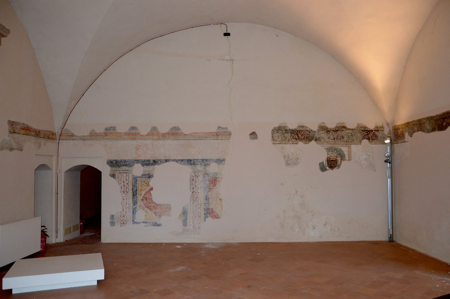 La Stanza della Museruola coincide con la torre di nord-ovest posta al pianterreno del Castello di San Giorgio. L'ambiente presenta un doppio partimento decorativo, probabilmente frutto della tramezzatura del vasto ambiente. Nel lato sinistro della parete meridionale si conserva una decorazione pittorica che si svolge al di sotto della lunetta, dividendo in tre registri la fascia murale. Il registro basso si articola in riquadri alla moresca - scanditi da candelabre a fondo bianco - di cui rimangono soltanto due moduli parziali che mostrano, peraltro, varianti nel disegno; al di sopra di una cornice grigia, si presenta una fascia intonacata di bianco entro cui sono tracciati graffiti verosimilmente non coevi all’epoca di realizzazione del complesso ornamentale; chiude il frammento una cornice modanata che rispecchia i toni dei riquadri inferiori. Il complesso decorativo cui doveva far parte la porzione pittorica in esame ricompare in lacerti nella parte destra della stanza, presso l’accesso meridionale