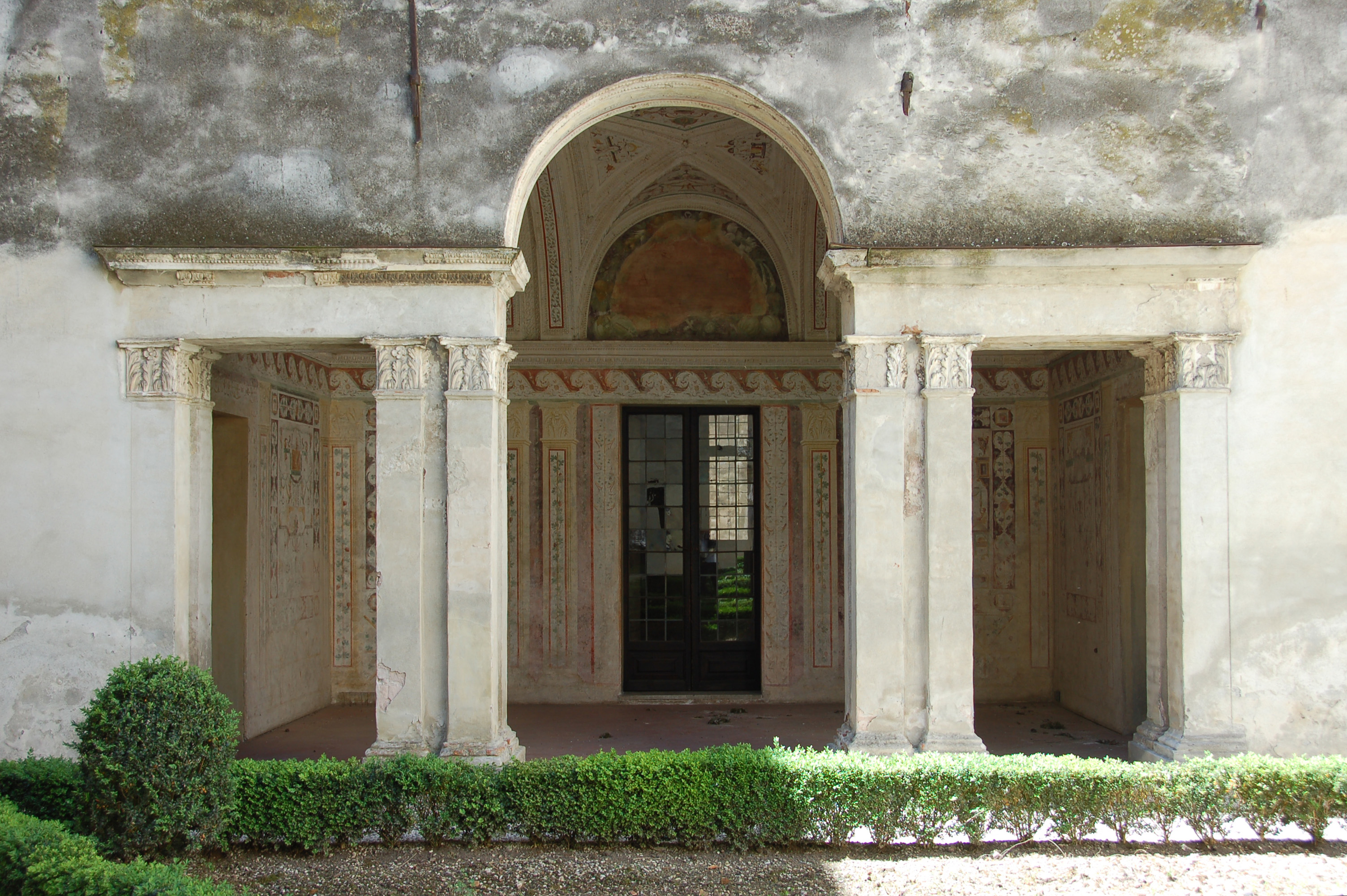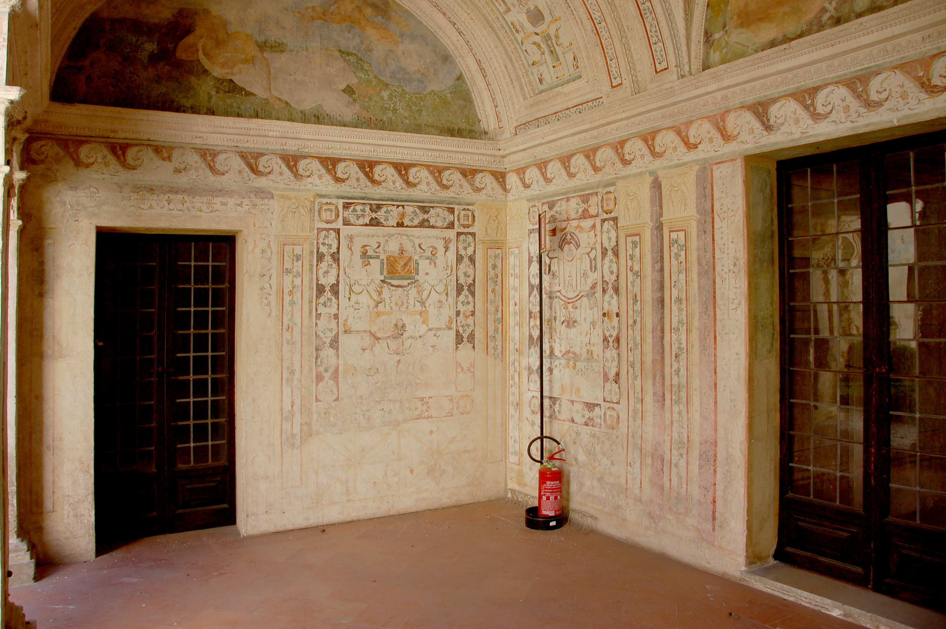 - NOTIZIE STORICO CRITICHE Accessibile dalla camera dei Cavalli e dai due camerini degli Uccelli e dei Falconi, tra i quali si colloca, la loggetta media il passaggio allo spazio aperto del cortile pensile dei Cani, dal quale prende il nome. Essa fu ideata e costruita nell'ambito dei lavori dell'appartamento di Troia diretti da Giulio Romano negli anni 1536-1539, ma la decorazione a fresco che ne ricopre volta e pareti spetta, come quella del vicino camerino degli Uccelli, a una fase successiva, committente il duca Guglielmo Gonzaga (1572 post). Dai documenti si apprende che la decorazione della loggetta, detta “camerino di mezzo”, avvenne nel 1536: notizia certamente riferibile a questo ambiente è che nel novembre di quell'anno è terminato il “cornisotto” in stucco. Eppure, della decorazione di epoca giuliesca, che si ipotizza a grottesche in continuità con il vicino camerino degli Uccelli e in relazione alla funzione stessa della loggetta, ambiente di mediazione verso il giardino, nulla si è conservato poiché l'apparato plastico in stucco, le grottesche e le scene dipinte di volta e pareti sono frutto di un intervento di epoca guglielmina. L'apertura a tre luci della loggetta dialogava con la serliana del mezzanino, collocata verso sud, nell'ambiente oggi designato come “cappellina” e accecata, in parte, dall'addossamento di una nuova fabbrica con cui il cortile dei Cani fu definitivamente chiuso sul lato meridionale (1587 post – 1595 ca.?). Consistenti gli interventi attuati nel corso del restauro diretto da Clinio Cottafavi (1927): le condizioni peggiori si rivelarono, allora, in corrispondenza delle lunette delle testate e sulle pareti. Rimosse le vetrate che chiudevano il lato sul giardino, si procedette al ripristino di parte degli intonaci e alla ripresa (da parte di Aldo Fiozzi) dei motivi a grottesche alle pareti, riconosciuta in quel frangente “di fattura posteriore a quelli molto più delicati del volto”. Arturo Raffaldini si occupò del restauro pittorico delle lunette. Agli anni Sessanta del secolo scorso risalgono lo stacco e successivo ricollocamento in situ dell'intera decorazione delle due pareti brevi