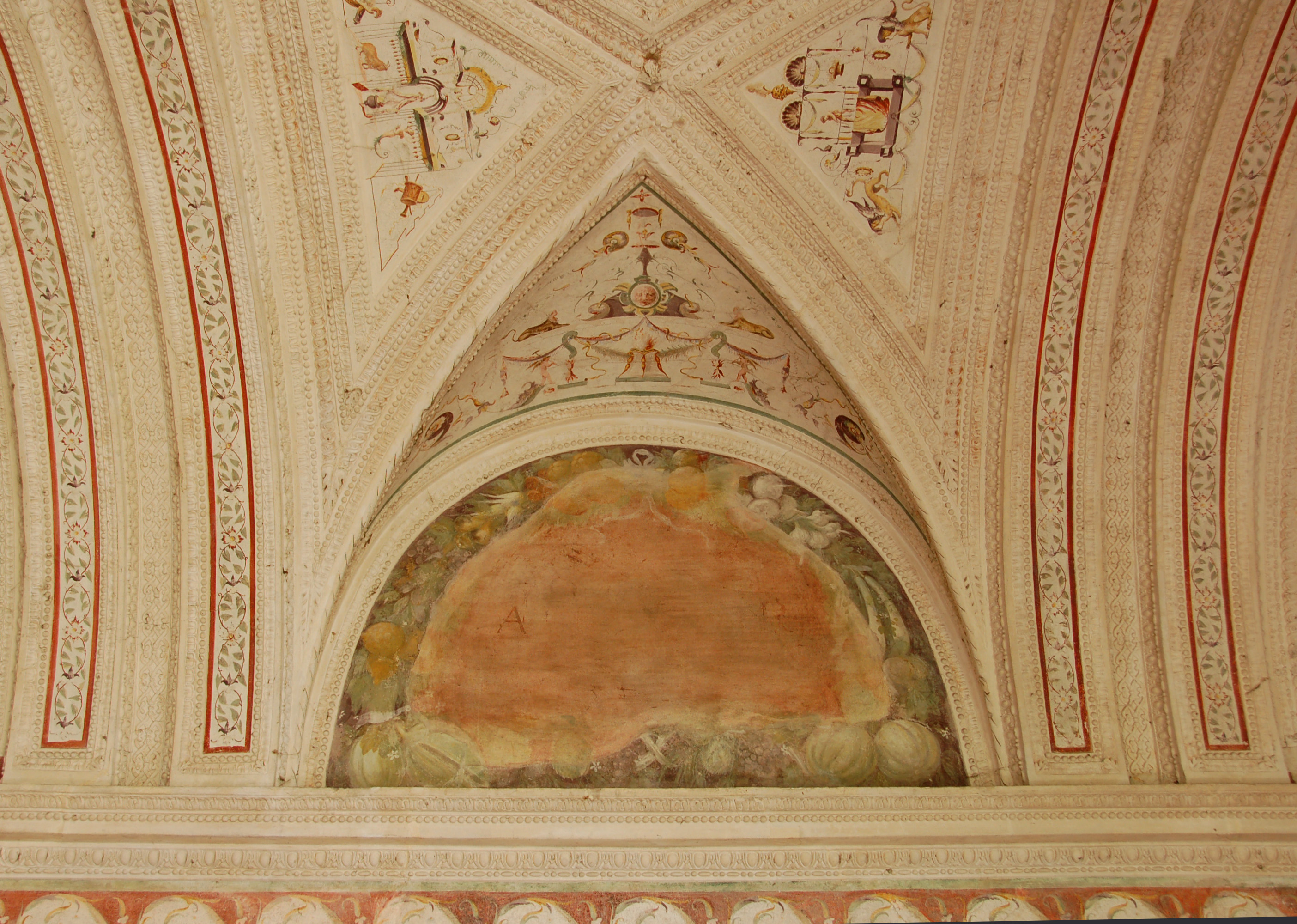 - NOTIZIE STORICO CRITICHE Al centro del lato occidentale della loggetta, al di sopra del cornicione in stucco corrente, si colloca una lunetta dipinta a fresco, in mediocre stato di conservazione. Dell'originaria decorazione si conservano solo le parti lungo il bordo interno, dove compaiono ortaggi e frutti disposti a festone: l'accuratezza del disegno e, per quanto intuibile, la qualità della stesura pittorica, si ricollegano senz'altro all'esecuzione delle nature morte presenti in otto cassettoni del soffitto della vicina camera dei Cavalli, confermando la presenza di uno specialista nell'ambito dei lavori promossi in questi ambienti da Guglielmo Gonzaga. Le due lettere capitali “A” ed “R” dipinte nell'area centrale della lunetta, caratterizzata da una stesura di color terra uniforme, riempitiva di una estesa lacuna, sono a mio avviso da interpretare come le iniziali del nome di Arturo Raffaldini, responsabile del restauro delle tre lunette della loggetta nel 1927