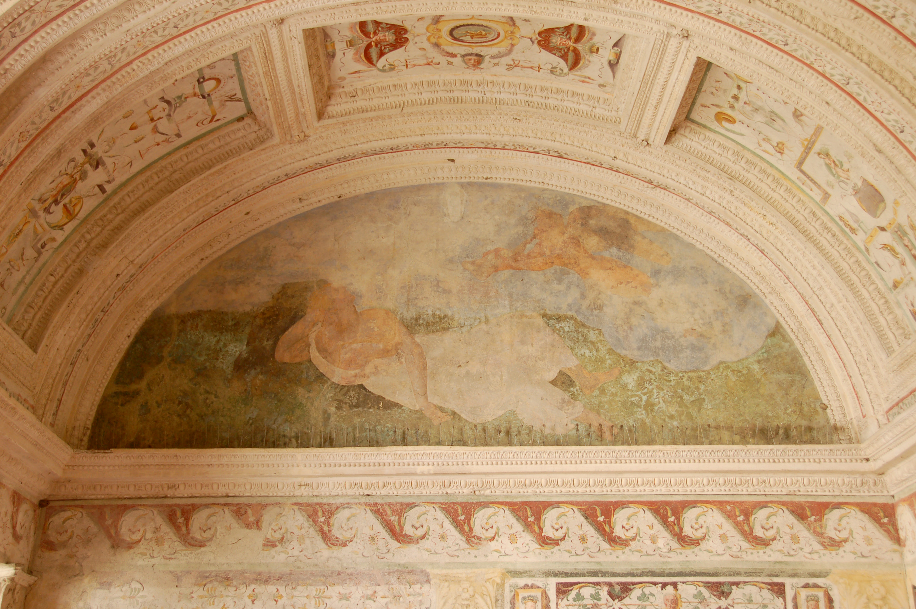 - NOTIZIE STORICO CRITICHE Sulla testata meridionale della loggetta, al di sopra del cornicione in stucco corrente, si colloca una lunetta dipinta a fresco, in pessimo stato di conservazione. Vi sono raffigurati una figura femminile distesa, il capo poggiato sul gomito, e un amorino in volo, in atto di suonare un aerofono in direzione della donna, probabilmente per destarla dal sonno. L'immagine è generalmente interpretata come personificazione della Primavera, benché Berzaghi (1992) abbia proposto di leggervi la figura della dea Proserpina, in pendant con Cerere dipinta sulla testata opposta. Il concetto di risveglio e di prosperità della natura, che dona i suoi abbondanti frutti (come visualizzato sulla lunetta del lato occidentale), è appropriato al senso dell'ambiente, con funzione di passaggio dalle camere interne al giardino. Ignota, al momento, la paternità dell'esecuzione del dipinto, che si assegna comunque alla mano di un pittore attivo per committenza di Guglielmo Gonzaga nel corso dell'ottavo decennio del XVI secolo