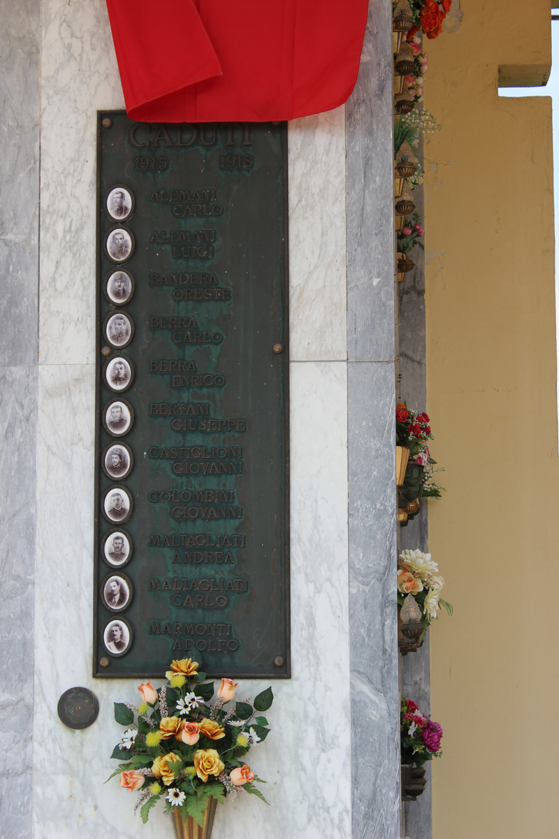 - ISCRIZIONI sulla targa posta sul pilastro di sinistra - CADUTI / 1915 1918 / ALEMANI CARLO / ALEMANI LUIGI / BANDERA ORESTE / BERRA CARLO / BERRA ENRICO / BERTANI GIUSEPPE / CASTIGLIONI GIOVANNI / COLOMBINI GIOVANNI / MALTAGLIATI ANDREA / MALTAGLIATI CARLO / MARMONITI ADOLFO - capitale - a caratteri applicati in bronzo -
