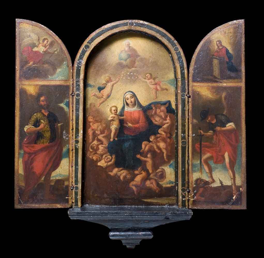 L’oggetto è un altarolo che in origine poteva essere appeso. Si compone come un trittico di cui il pannello centrale è fisso e le due ante ai lati si possono chiudere. La parte esterna è pure dipinta con l’IHS di grande dimensione. All’interno si presenta una Madonna Assunta, ma con una iconografia non perfettamente corrispondente al soggetto in quanto la Vergine regge il Bambino e sopra di lei due angeli reggono la corona di stelle. Alla sommità Dio Padre sulle nuvole. L’Annunciazione è posta nella porzione superiore delle ante (occupa un terzo del pannello): in quella di sinistra è raffigurato l’Arcangelo Gabriele, su quella destra la Vergine Annunciata. Nelle sottostanti porzioni, che occupano i due terzi, si trovano rispettivamente: S. Marco evangelista e S. Michele Arcangelo