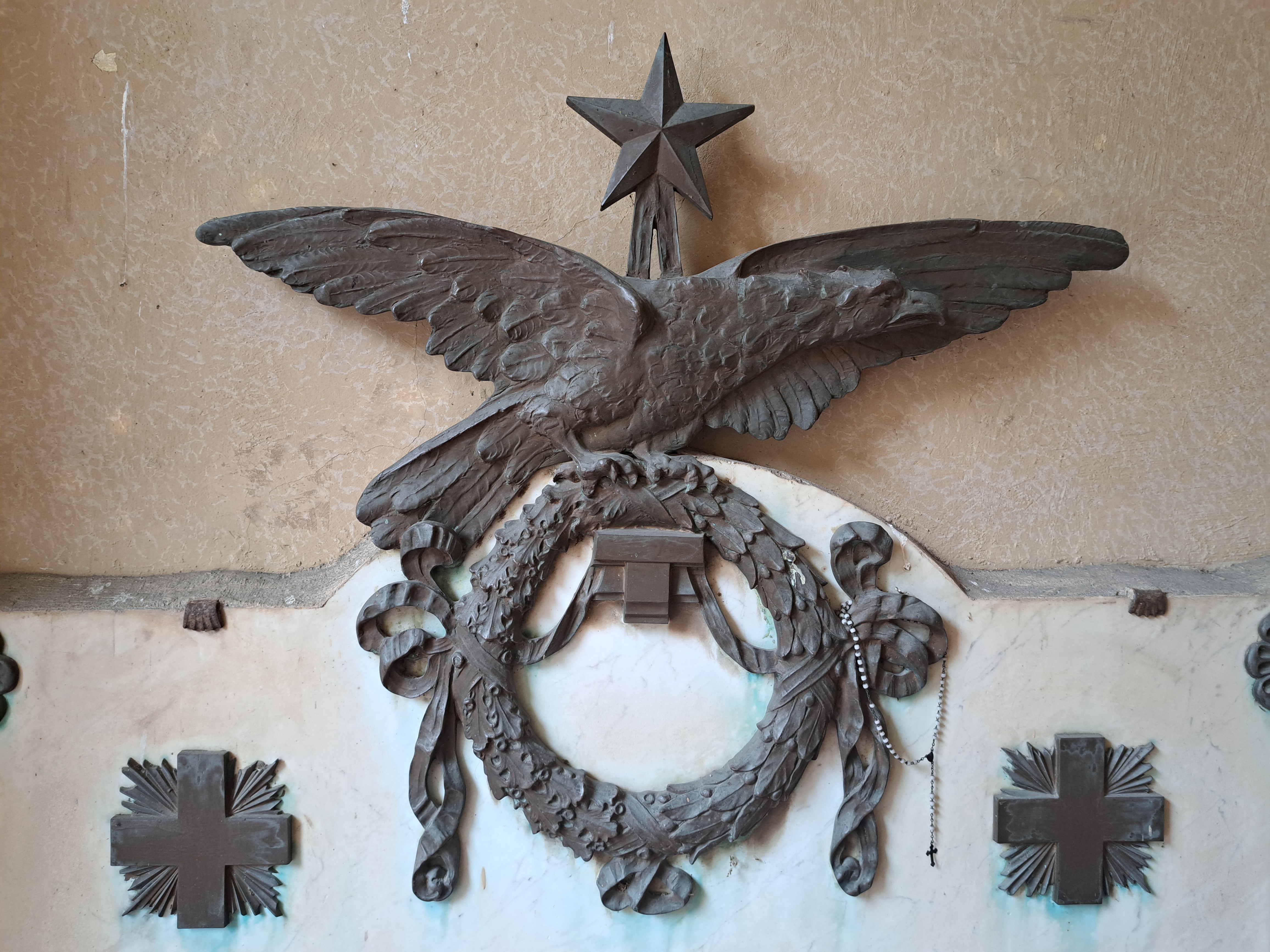 - NOTIZIE STORICO CRITICHE La lapide fu inaugurata domenica 11 settembre 1921. Era intenzione del comitato promotore fra una cerimonia "nell'intima famigliarità del nostro paesello". Tuttavia, la cerimonia assunse importanza e solennità per l'intervento dell'onorevole e sindacalista Guido Salvadori, del Partito Popolare Italiano. Oratore ufficiale fu don Angelo Barcellandi da Brescia, già cappellano militare nel battaglione alpino "Monte Cavento" sul fronte del Tonale. Nell'occasione fu inaugurata e benedetta anche la bandiera della locale sezione dell'Unione Nazionale Reduci di Guerra. E' chiaro, quindi, che in questo caso specifico la festa patriottica fu declinata politicamente in senso cattolico. S'ignora, poiché la fonte tace, dove fosse collocata in origine la lapide: se nel cimitero o sulla facciata del municipio (Brozzo fu inglobato da Marcheno nel 1927). In epoca successiva, a Brozzo fu eretto anche un modesto obelisco ai caduti, presso la chiesa parrocchiale, tutt'oggi esistente, opera di un certo Bossini di Sarezzo (cfr. firma sul basamento). L'identico massiccio fregio con l'aquila si è riscontrato anche su altre lapidi ai caduti della provincia, come nella vicina Marcheno, ma anche altrove, come a Scarpizzolo, Provezze e Novagli di Montichiari. Questa lapide è assai simile a quella di Provezze (1920), opera della Ditta Bonifacio, che fabbricò anche quella della vicina Marcheno nel 1921 (cfr. specifica scheda di catalogo). Fonti e bibliografia: Da Brozzo. In onore dei caduti, "Il Cittadino di Brescia", 22-9-1921