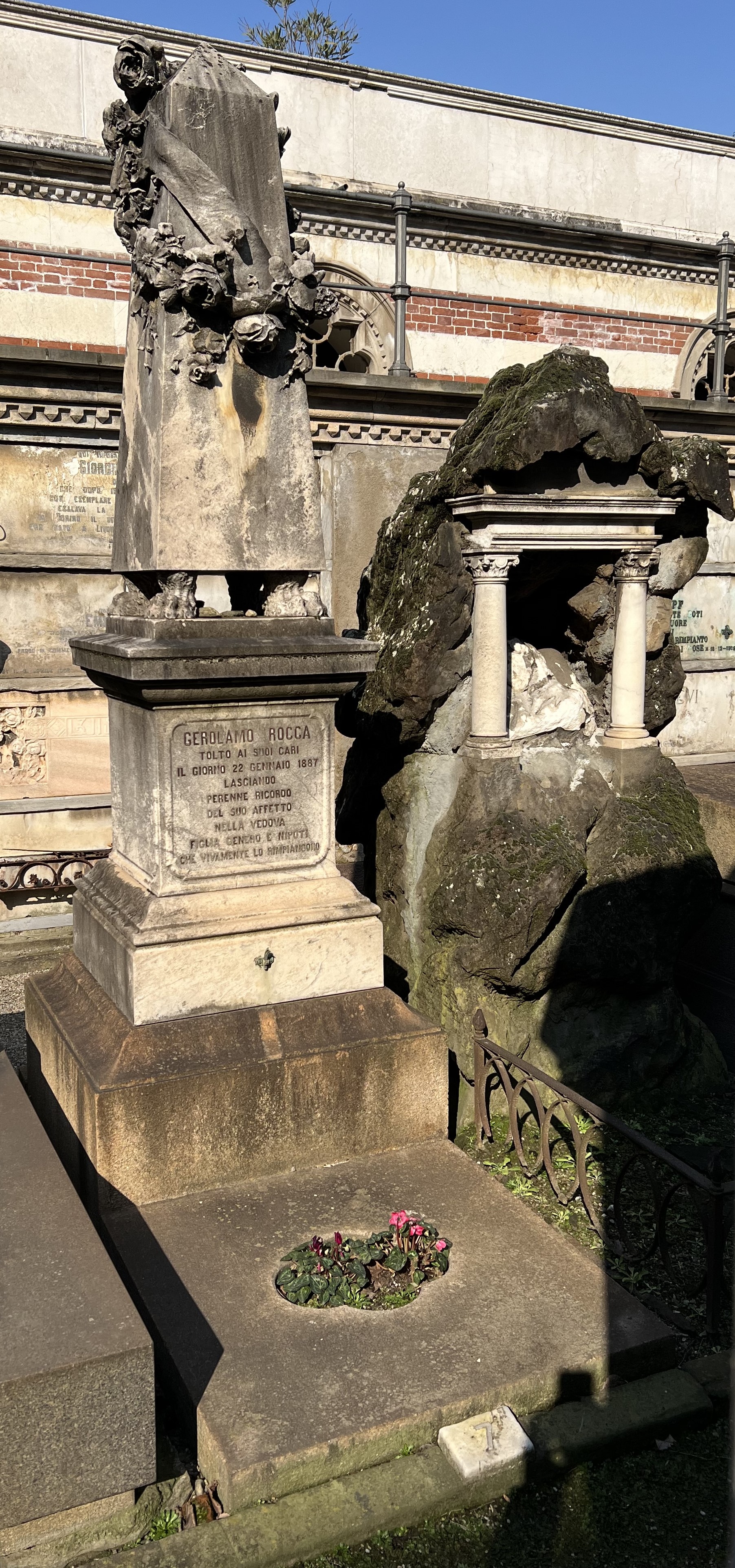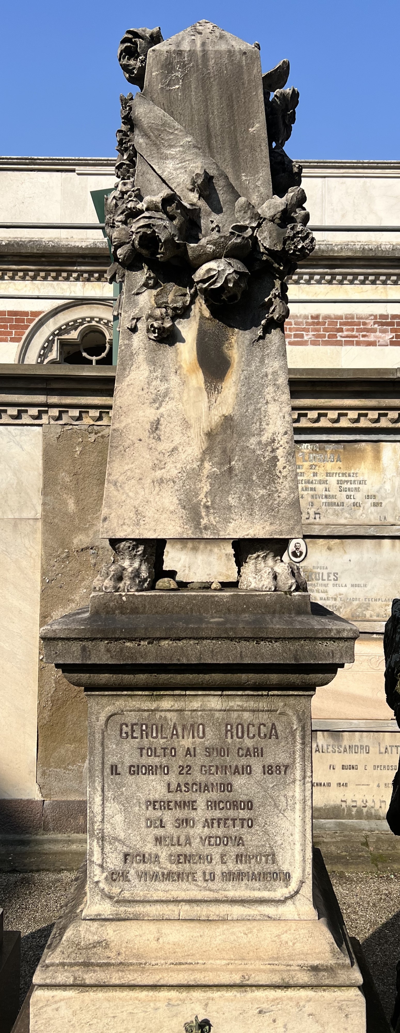 - ISCRIZIONI al centro - Gerolamo Rocca tolto ai suoi cari il giorno 22 gennaio 1887 lasciando perenne ricordo del suo affetto nella vedova figlia genero e nipoti che vivamente lo rimpiangono -