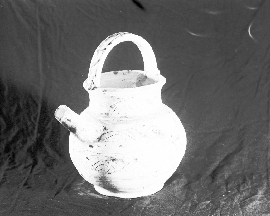 Grande versatoio a corpo globoso, con beccuccio cilindrico e manico a nastro. La bocca presenta orlo rinforzato leggermente estroflesso. La decorazione corre su tre fasce orizzontali segnate da doppie linee tracciate con molta trascuratezza e consiste in tralci vegetali appena abbozzati, che si estendono anche al manico; sul beccuccio, rigature verticali e trasversali alternate