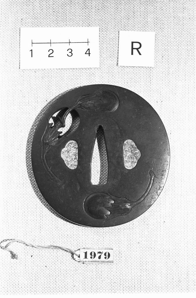 Tsuba di forma ovale. Ryohitsu tamponato e decorato in oro. Lavorazione in nunome-zogan in oro, keko-gaki, ko-sukashi, unusuki-bori. Raffigura tre piccole melanzane