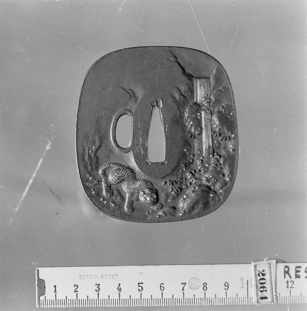 Tsuba rettangolare con katahitsu. Lavorazione in sukidashi-bori, iroe-taka-zogan, nunome-zogan. Sul recto è rappresentata una tigre presso una cascata, sul verso un corso d'acqua tra le rocce