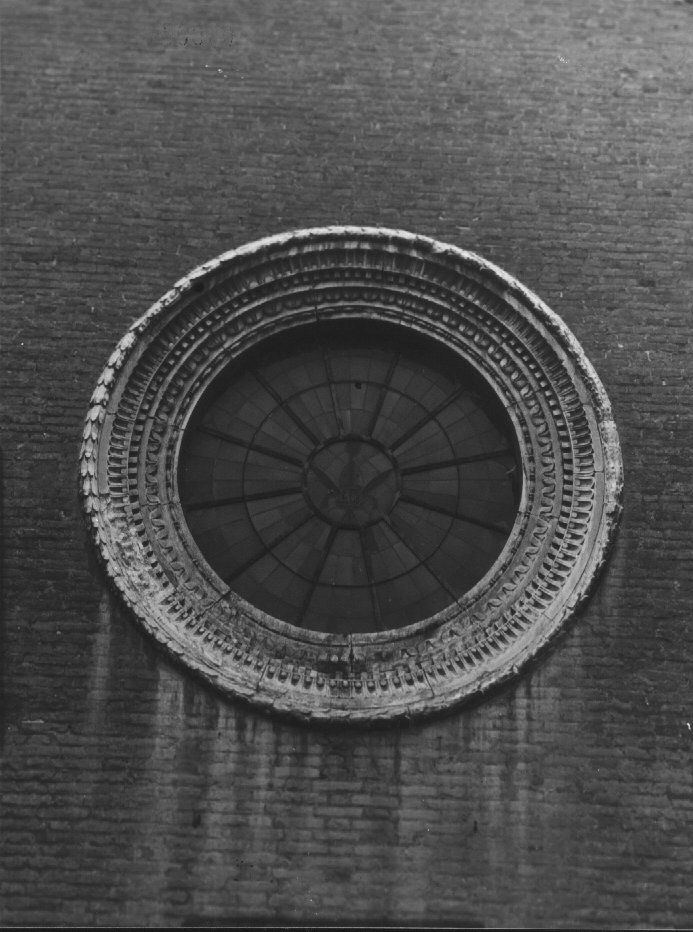 La decorazione del rosone comprende dall'esterno: un giro di foglie d'alloro, perle, dentelli, foglie a calice e astragali