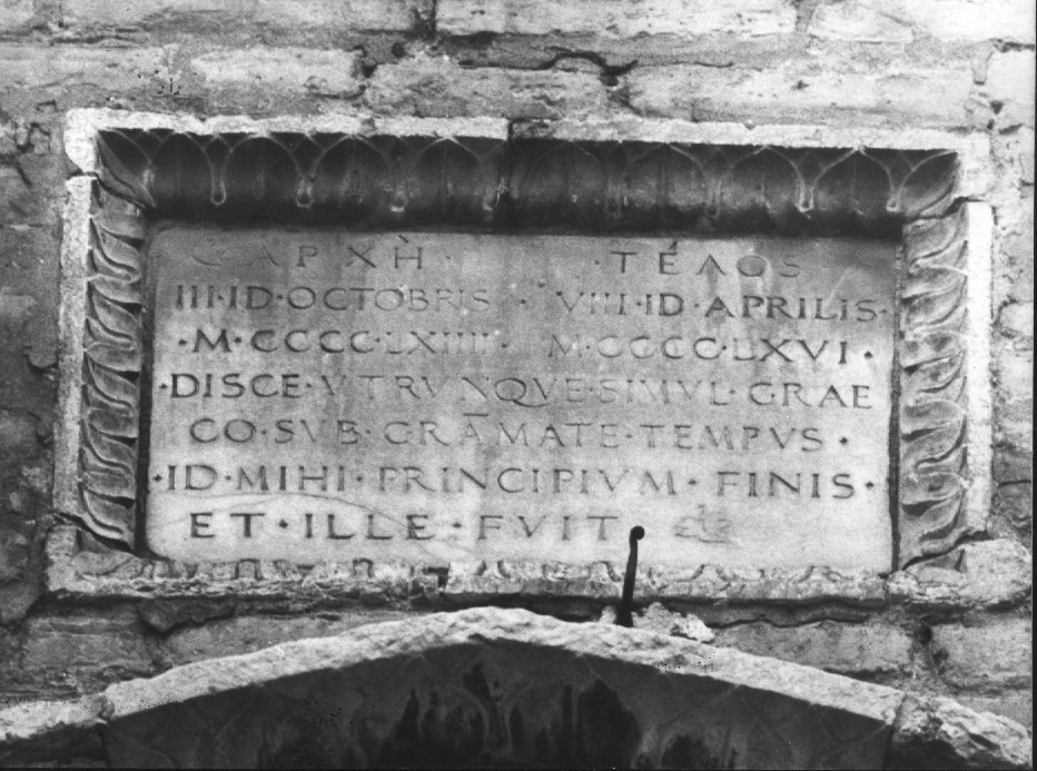 - ISCRIZIONI ARCHE' TELOS/ III ID. OCTOBRIS VIII ID. APRILIS/ MCCCLIIII MCCCLXVI/ DISCE UTRUMQUE SIMUL GRAE/ CO SUB GRAMATE TEMPUS/ ID MIHI PRINCIPIUM FINIS/ ET ILLE FUIT - al centro - lettere capitali -