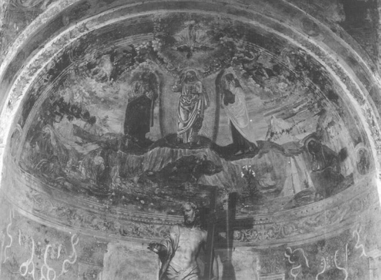 - NOTIZIE STORICO CRITICHE La data 1539 S accettata con qualche riserva dalla letteratura artistica che ha cercato di sciogliere il problema rappresentato dal quinto posto dopo la data senza giungere peraltro a soluzioni convincen- ti. La presenza di frammenti, ormai quasi illeggibili, di altri affre- schi nelle absidiole e nella parete destra hanno fatto ipotizzare la presenza di un intervento anteriore anche nel catino absidale