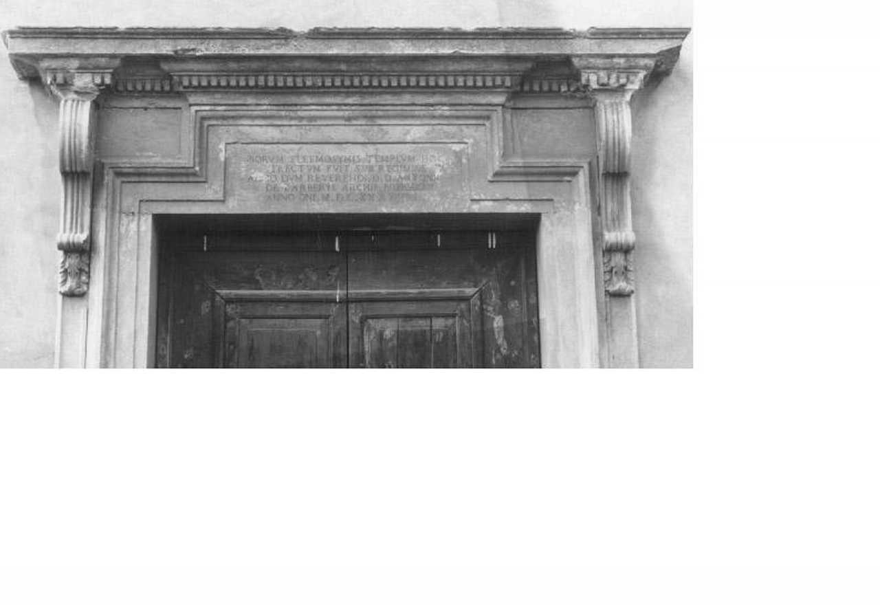 - ISCRIZIONI al centro - PIORVM ELEEMOSYNIS TEMPLVM HOC/ ERECTVM FVIT SVB REGIMINE/ ADMO DVM REVERENDI D.DANTONII/ DE BARBERYS ARCHIP.BODOLONI/ ANNO DNI.M.DC.XXXXVIIII - lettere capitali - a solchi - latino