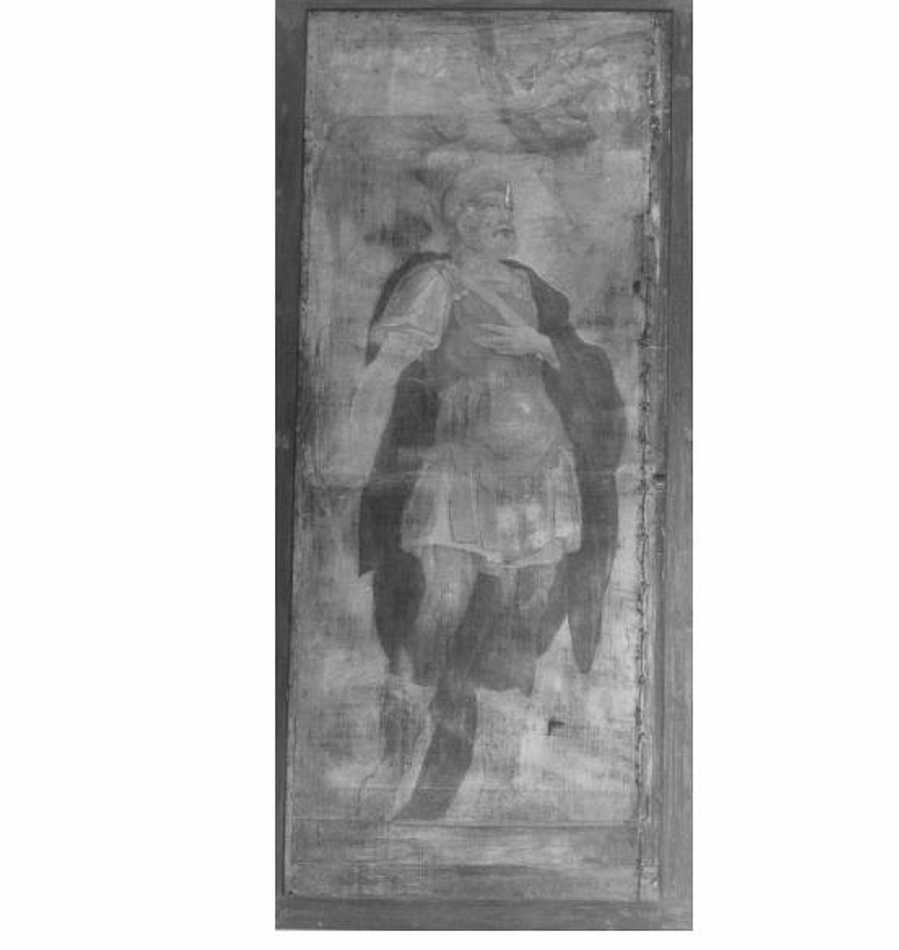 Personaggi: San Faustino. Attributi: (San Faustino) palma del martirio. Abbigliamento: calzari romani; tunica romana; mantello; elmo. Figure: angelo