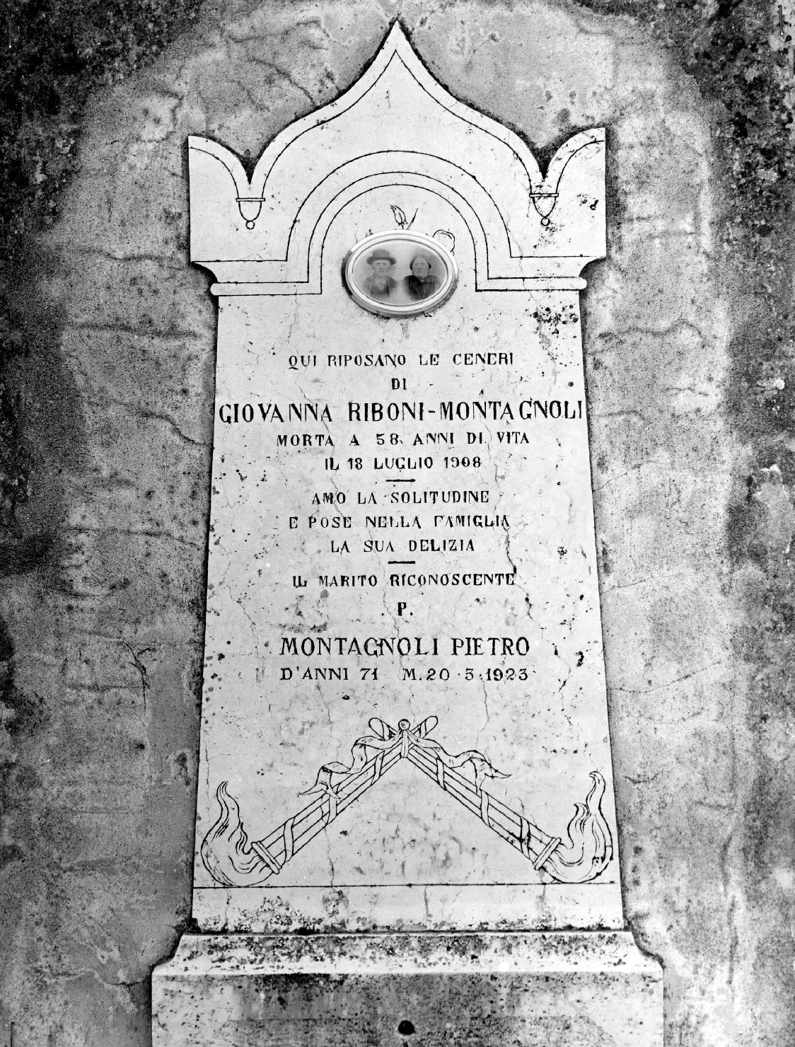 - ISCRIZIONI centro - QUI RIPOSANO LE CENERI/ DI/ GIOVANNA RIBONI-MONTAGNOLI/ MORTA A 58 ANNI DI VITA/ IL 18 LUGLIO 1908/ AMO' LA SOLITUDINE/ E POSE NELLA FAMIGLIA/ LA SUA DELIZIA/ IL MARITO RICONOSCENTE/ P./ MONTAGNOLI PIETRO/ D'ANNI 71 M. 20.3.1923 - lettere capitali -
