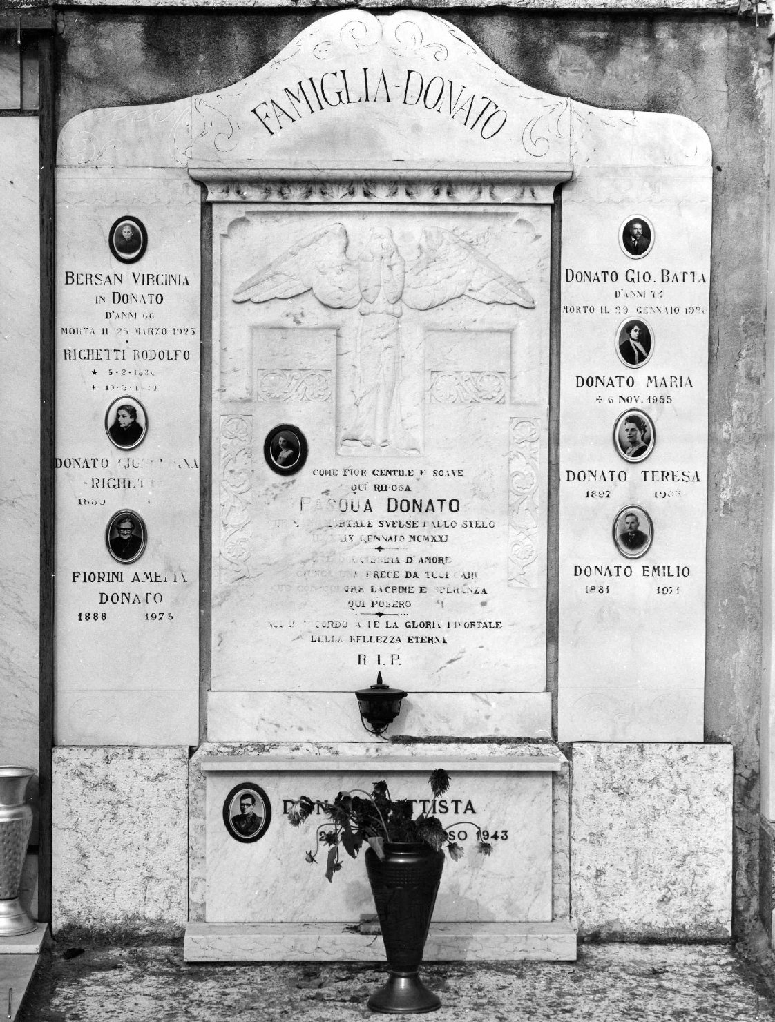 - ISCRIZIONI centro - FAMIGLIA - DONATO/ COME FIOR GENTILE E SOAVE/ QUI RIPOSA/ PASQUA DONATO/ CHE MANO MORTALE SVELSE DALLO STELO/ IL XXIV GENNAIO MCMXXI/ A TE DOLCISSIMA D'AMORE/ GIUNGA UNA PRECE DAI TUOI CARI/ CHE CON DOLORE LACRIME E SPERANZA/ QUI POSERO/ A NOI IL RICORDO A TE LA GLORIA IMMORTALE DELLA BELLEZZA ETERNA - lettere capitali -