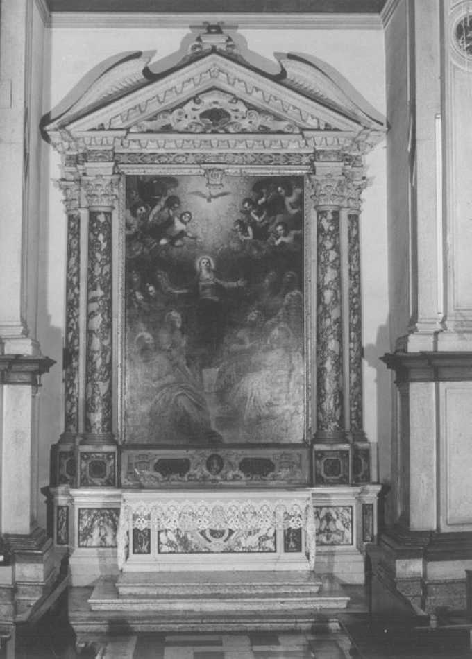 Due colonne e due semicolonne lignee fingenti marmo variegato, con capitelli corinzi sormontati da due dadi, addossate a semipilastri bianchi sorreggono il frontone in legno, fingente marmo bianco. Il dossale poggia su un alto stilobate di marmo bianco, con inserti policromi rossi, che si ritrovano anche sul paliotto