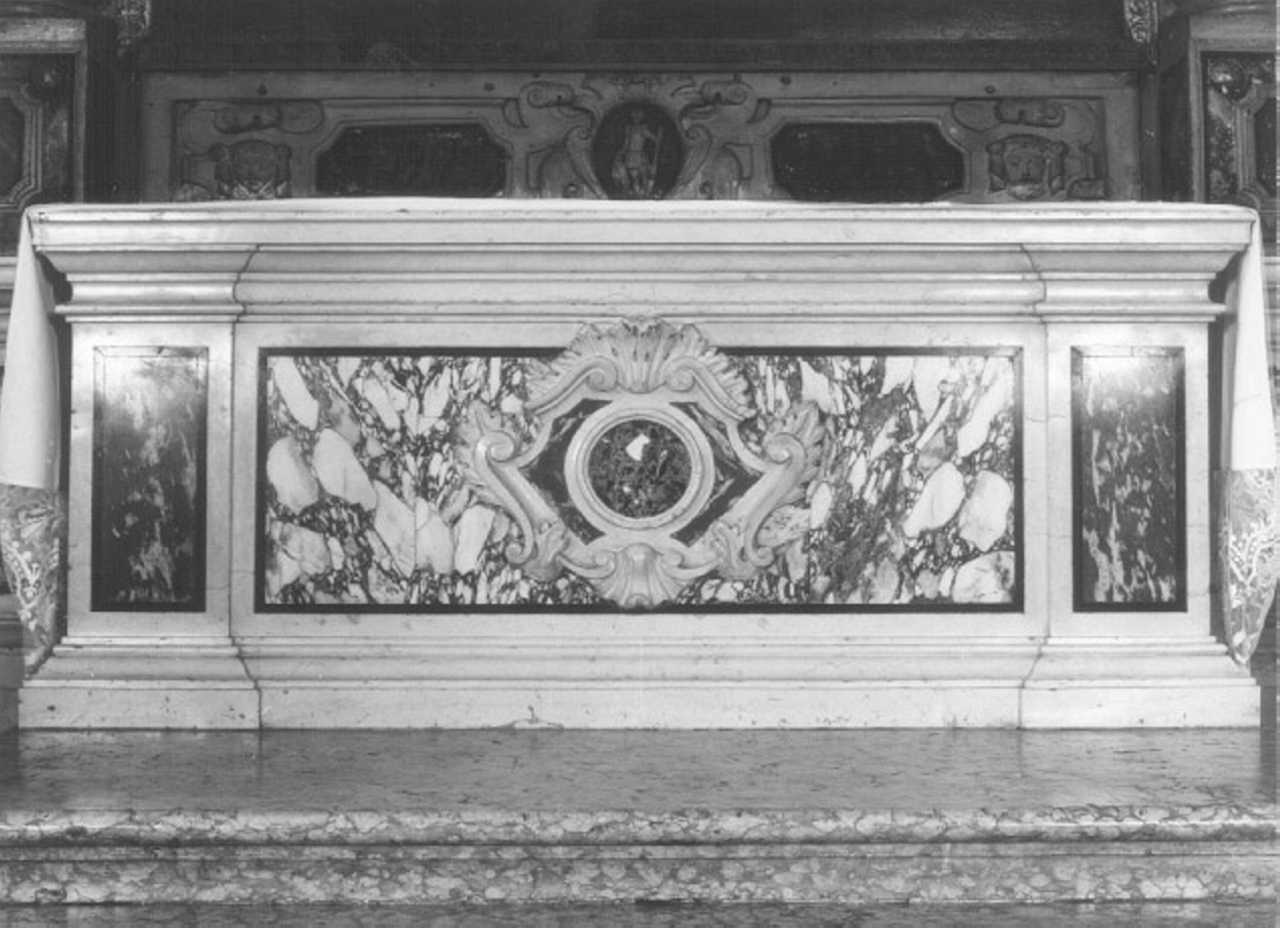 Fra due fasce di marmo bianco modanate s'inscrive la fronte, sulla cui specchiatura centrale in marmo variegato, rettangolare, poggia una cornice bianca, mistilinea, con foglie d'acanto, a racchiudere due inserti poligonali in marmo rosso (come le due piccole specchiature laterali), intorno ad una cornice sferica bianca, che definisce un ulteriore inserto in marmo verde
