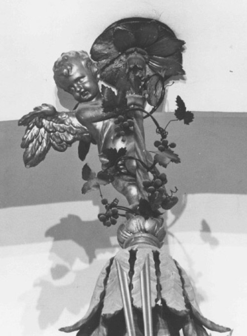 Il putto con le ali spiegate è in piedi sulla corolla del fiore di cui regge lo stelo.La testina è rivolta a sinistra, la gamba destra è leggermente flessa